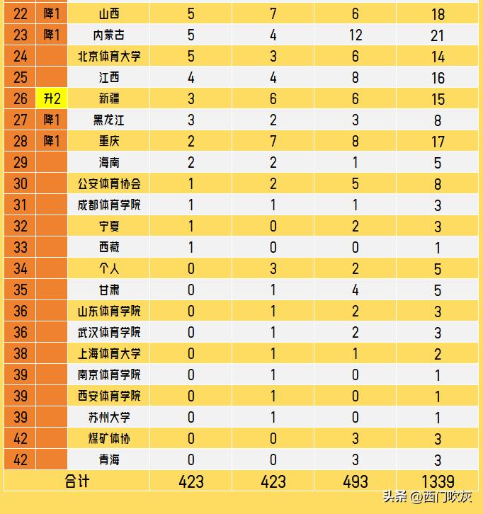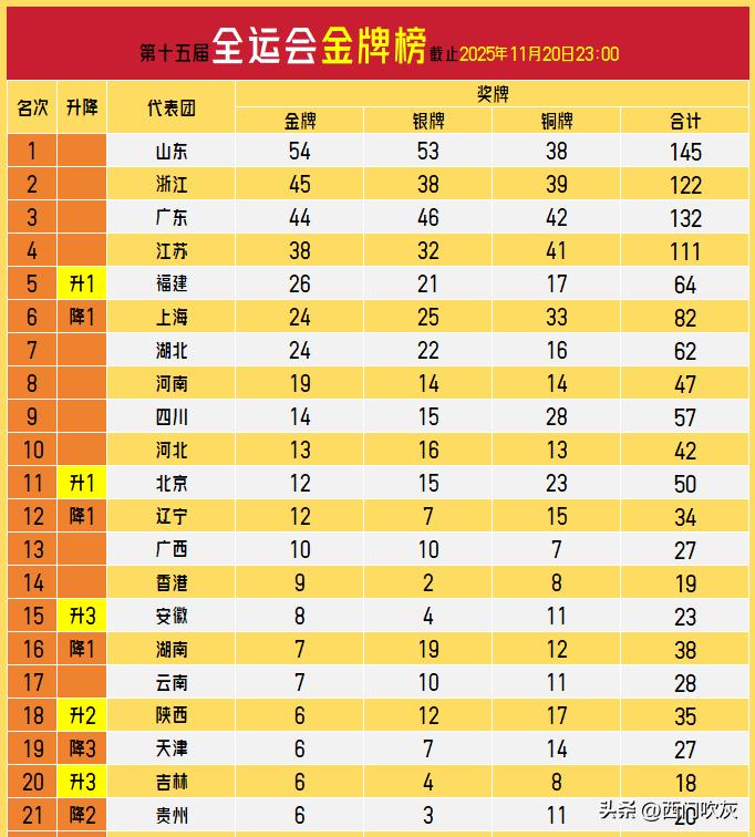 【距离收官仅差两项!截止20日23点全运会奖牌榜!】 山东以54金53银38铜提前锁定金牌榜和奖牌榜双榜第一!银牌也是第一! 福建、北京压哨上升一位,安徽、陕西各吉林全部冲进金牌榜前二十。 金牌榜已无悬念,静待全运收官!