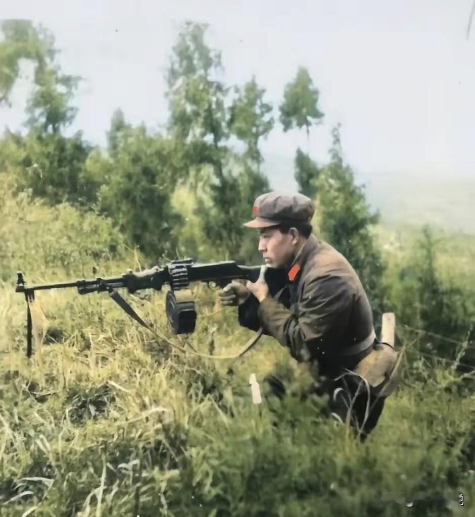这名正在射击的战士应该是一名班长或者副班长,他手中是56式班用轻机枪,由于该枪没有快慢机,所以只能打连发,但在一些经验丰富的老兵手中是可以打出单发的,而且还可以在弹链上想办法打单发,并且很精准。