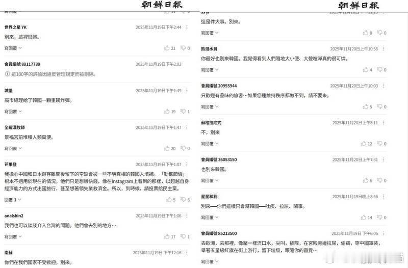 【中国游客恐大量涌入?韩国网友急喊:别来!甚至有人提议“我们也说有事”】日本首相高市早苗发表“台湾有事”言论后,中日关系急剧紧张。中国近日接连推出“禁止赴日”相关提醒,劝阻公民前往日本旅游,使韩国迅速成为中国游客取代日本的主要目的地。相关韩媒报道引发韩国网友大面积崩溃留言:“不要来!”、“求求别来韩国!”甚至有人抱怨:“高市给韩国扔了颗重磅炸弹。”更有网友半开玩笑地提议,干脆韩国也发表“有事”言论,“这样他们(中国游客)就会去别的地方了。”据《朝鲜日报》报道,多家中国旅行社近期接连出现日本团大规模取消的情况,旅行社称赴日旅游团和航班的取消率都明显攀升。但这些旅游需求正明显转向韩国。上周末,韩国已经正式反超长期位居榜首的日本,成为中国游客最热门的海外旅游目的地。报道指出,目前中国出境游最畅销的机票目的地已转为韩国,首尔的搜索量持续飙升,其次才是泰国、香港、新马等地。有分析认为,中国游客锐减可能会使日本GDP损失超2万亿日元。然而,在相关报道下方,大批韩国网友反应强烈,留言几乎一面倒排斥中国游客:“不!别来!”、“也别来韩国!”、“你们只会在韩国随地吐痰、制造混乱”、“去其他国家吧,别来韩国”、“拜托还是去日本吧”、“高市给韩国添了大麻烦”。也有人调侃称:“我们也可以说一句有事,让他们换个地方去。”图1:中国近日祭出一连串「禁日令」,呼吁公民勿前往日本旅游,这也让韩国成为中国游客替代日本的去处。图为首尔景点景福宫。 (欧新社)图2:网友在相关新闻下方留言。 (取自朝鲜日报,经Google翻译)