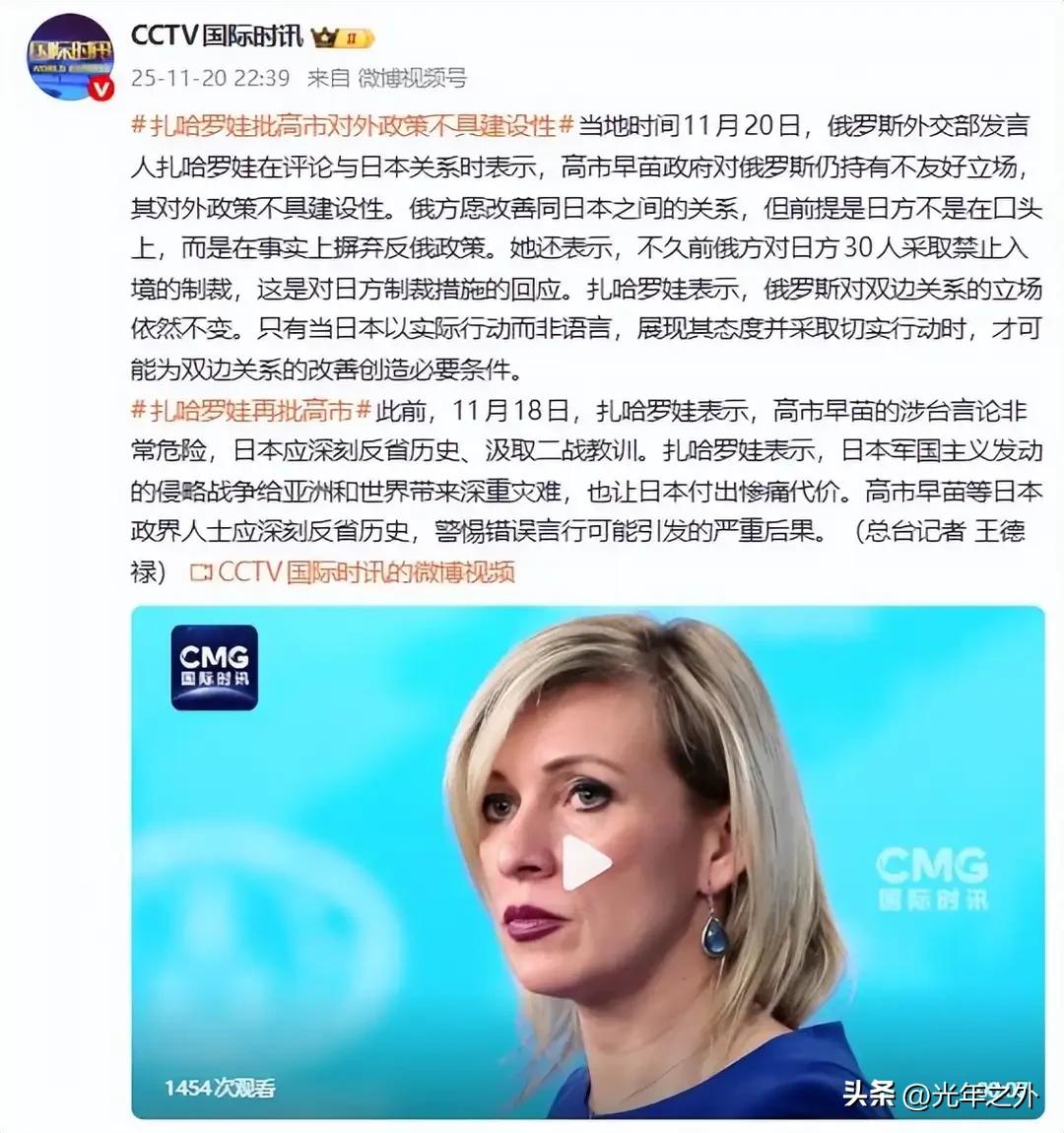11月20日,俄外交部发言人扎哈罗娃直接点了日本高市早苗政府的名:嘴上喊着要改善日俄关系,实际却跟着西方搞对俄制裁、在北方四岛问题上频频放硬话,对外政策全是添乱的套路。俄方明明白白放话了,要修复关系行,但得来真的,别光耍嘴皮子,得把这些反俄操作彻底扔了。 评论:高市早苗政府一边抱紧美国大腿凑反俄热闹,一边还想让俄罗斯在领土问题上让步,这不就是对着公牛弹钢琴——白费劲嘛。历史遗留的领土争端本就需要诚意化解,偏要搞“口惠而实不至”的戏码,忘了制裁从来都是双向伤害。俄方要的是实打实的立场转变,不是虚头巴脑的外交辞令,再这么“选边站”下去,日俄关系只会在僵局里越陷越深,最终吃亏的还是自己。