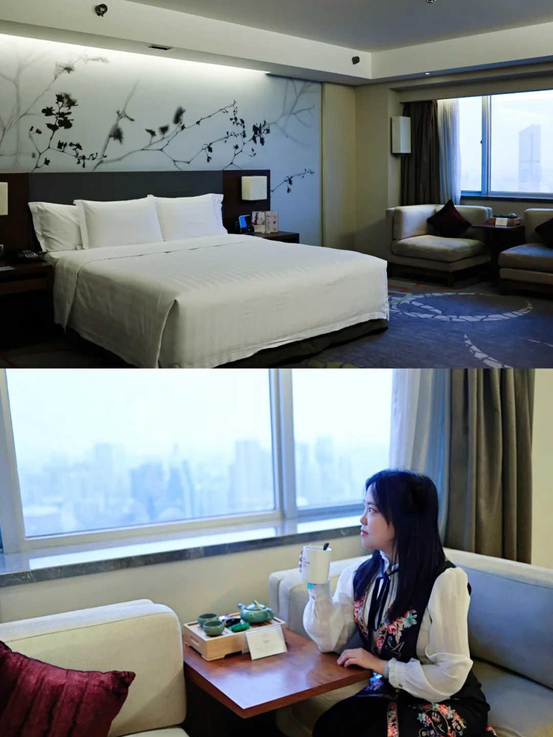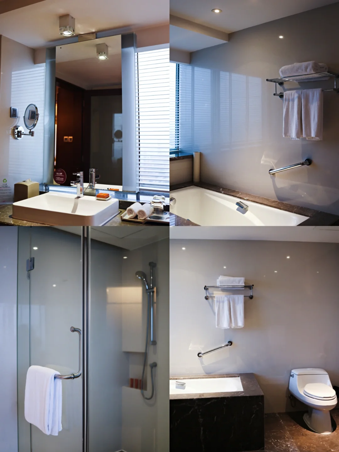 🌟本次入住的是行政豪华大床房(含行政礼遇)。房内空间宽敞,客房、衣帽间、卫生间三个大空间间隔得当。床品舒适,枕头有多种高度选择。浴缸旁备了一小包浴盐,这个小细节让我感觉很贴心😘。透过客房内的玻璃窗,隔绝了窗外的喧闹之声,可将尽览宁静高楼林立,车水马龙的繁华城景。