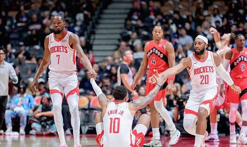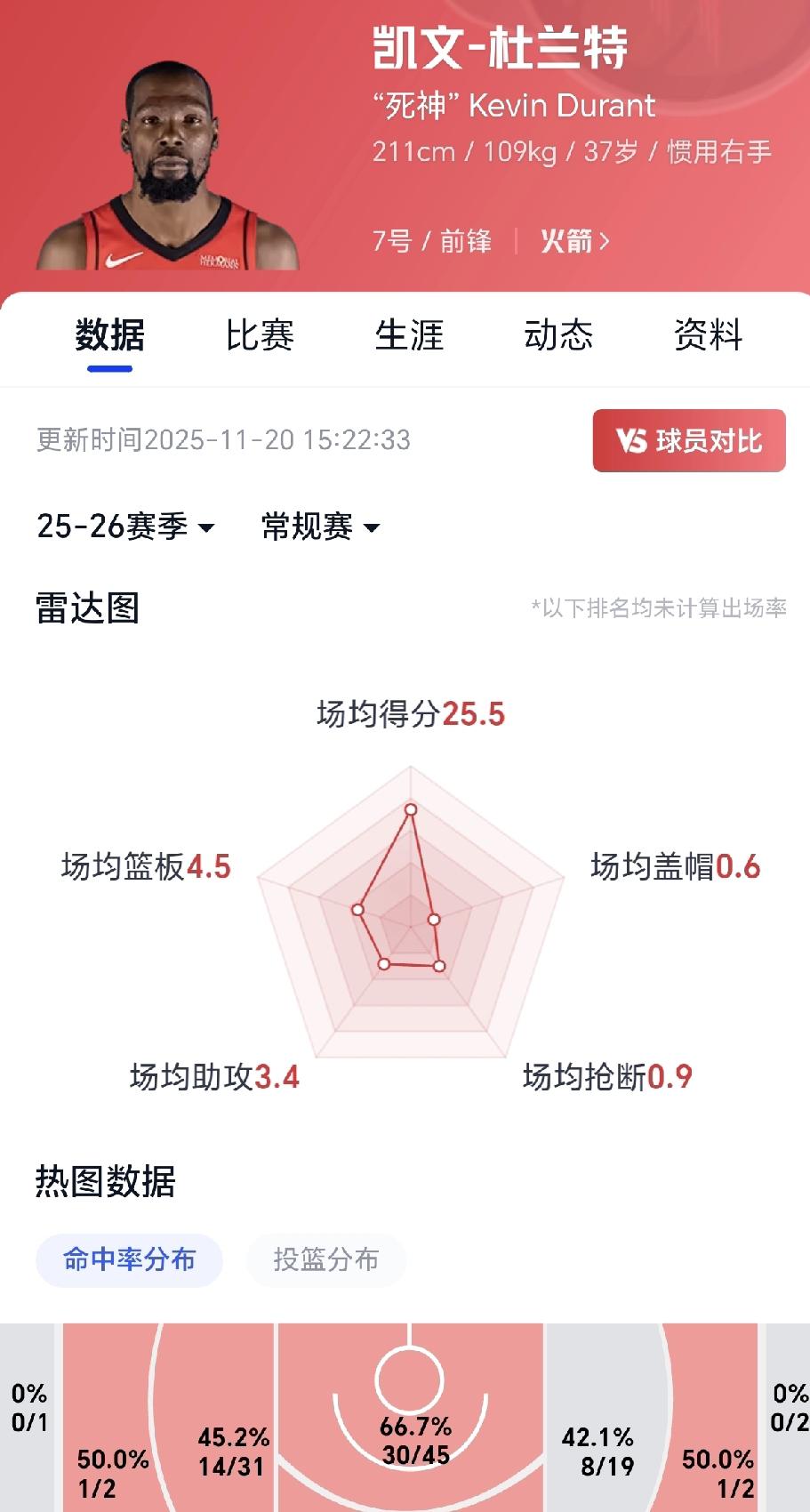 火箭8人换杜兰特1人值不值?数据告诉你。 北京时间11月20日,火箭客场114-104战胜骑士取得5连胜,近11战更是取得了10场胜利。 火箭目前已经打完13场比赛,10胜3负的他们排名西部第三。 休赛期火箭用狄龙、格林等8人换取杜兰特1人。杜兰特来到火箭后,对火箭的帮助很大,这也是本赛季火箭蜕变的原因。 杜兰特代表火箭打了13场比赛里,场场都是首发,场均上场36.1分钟,场均得到25.5分4.5篮板3.4助攻0.9抢断0.6盖帽,投篮命中率49.6%,三分命中率37.7%,罚球命中率87.7%。 这种表现的杜兰特,火箭8换1值得吗?咱们评论区见。