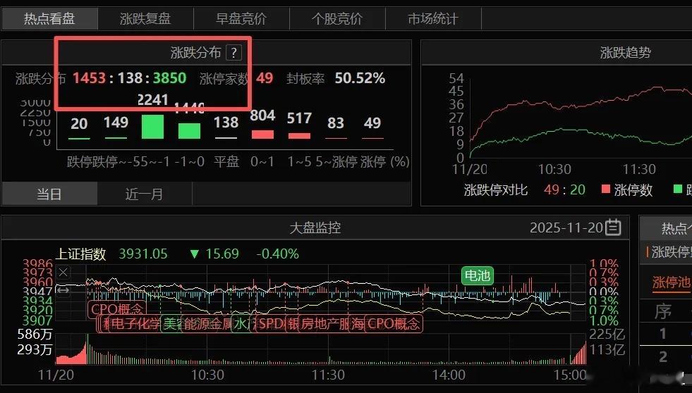 11月21日A股策略:情绪触底临近,反弹窗口或渐行渐近一、市场核心观点原预期量化主导下的震荡轮动格局,未料市场情绪恶化超预期,除银行、保险、石油等防御性板块外,其余赛道亏钱效应蔓延。成交额持续萎缩,机构资金进入休整状态,市场交投意愿低迷,若非银行板块强力护盘托举指数,大盘或已下探至3900点附近。短期仍定义为弱势调整阶段,需等待放量阳线出现以打破当前弱势预期,重构市场信心。当前市场方向呈现随机无序特征:盘前利好题材多遭遇开盘即砸盘(如海外算力概念),盘中轮动反弹主线多依赖消息刺激(如锂矿、地产板块),而缺乏消息支撑的板块则因资金向金融板块虹吸,持续承压下行。整体操作难度极高,建议以“多看少动”为核心原则,临近年底,市场提前进入休整状态的资金规模也在逐步扩大。二、板块节奏解析1. 锂电池板块日内锂矿成为板块内唯一强势分支,盐湖股份、天齐锂业等核心标的保持抱团态势;而六氟磷酸锂、电池添加剂、正负极材料等中下游环节则延续调整。当前行业格局与昔日光伏产业逻辑相似:上游锂矿价格持续上涨,导致中下游企业订单承压,相关个股估值回调,进而反向传导至上游板块,引发全产业链集体走弱。下游企业已出现明显负反馈,当前阶段暂不具备参与价值,需等待明确止跌信号释放后再择机布局。2. 科技方向前期高辨识度科技标的跌幅逐步收窄,整体进入震荡磨底阶段,无需过度恐慌,后续指数能否企稳回升,科技板块的表现将成为关键变量。 海外算力:需重点关注英伟达晚间表现,明日中际旭创、新易盛、天孚通信作为板块中军标的,其走势将引领板块情绪; 谷歌链:腾景科技、德科立等标的已累积一定涨幅,当前不建议追高介入; 自主可控主线:光刻机、光刻胶及半导体材料赛道逻辑稳固,鼎龙股份、晶瑞电材等标的可长期跟踪; 存储方向:当前市场热度集中于妖股炒作,业绩预期暂被忽视,但板块下跌空间已相对有限,后续需关注估值修复机会。行业层面,存储芯片涨价趋势未改,兆易创新等核心标的值得留意。3. 其他方向其余板块暂无明确主线逻辑,市场关注度降至低位。当前市场情绪已触及悲观极值,而历史经验表明,极致悲观往往是反弹的前兆,后续需重点关注市场情绪修复带来的整体性机会。