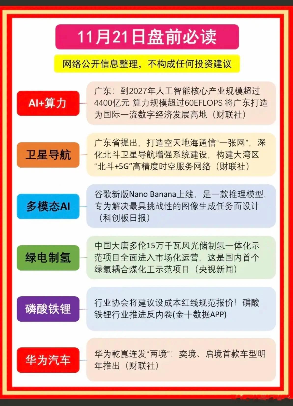 11.21周五 盘前 财经热点汇总!1.算力+ai2.卫星导航3.多模态ai4.绿电制氢5.磷酸铁锂6.华为汽车
