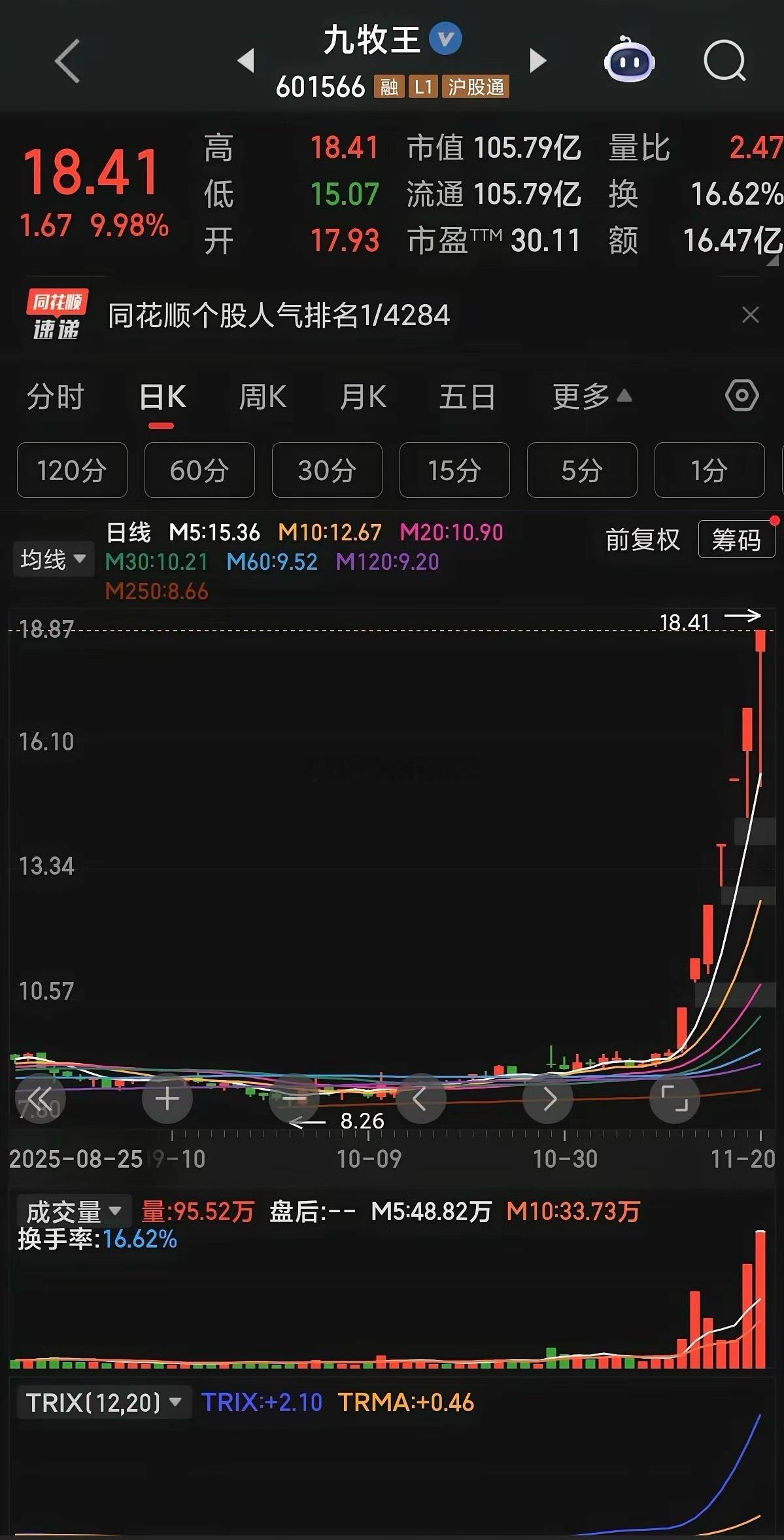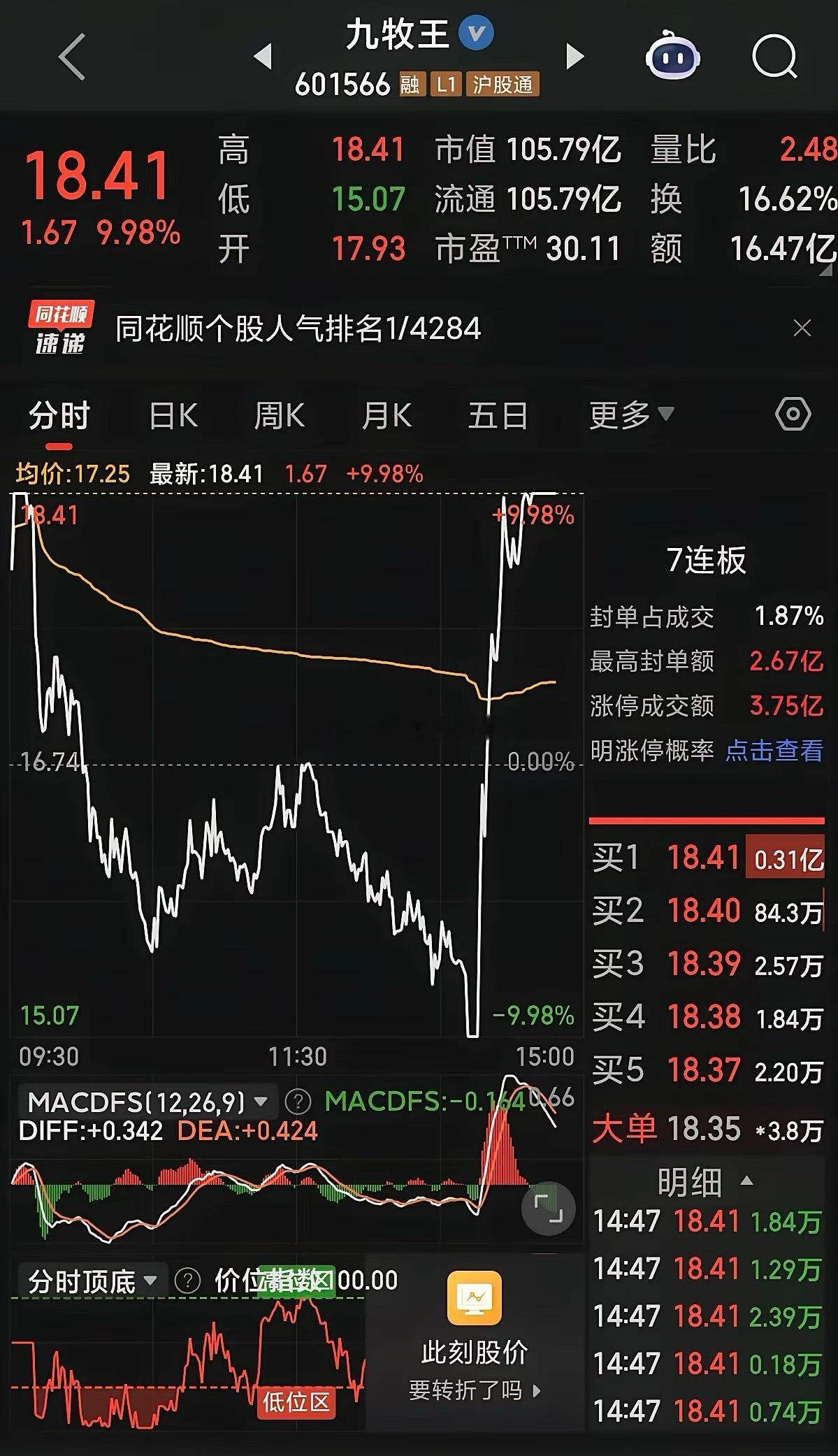 九牧王今天股市最靓的仔。大游资就是牛逼,涨停还是跌停也就是打个响指的事情。天地天,玩的真溜。有人赚的疯狂,跌停板15.07元买入,瞬间涨20%到18.41元。有人亏的呆傻,涨停板18.41元买入,忽忽悠悠就跌到了15.07元。有钱的游资真会玩。总有很多散户想着背靠游资想在游资的大锅里吃点肉。玩的好的吃别人的肉,玩不好的被别人当肉吃。