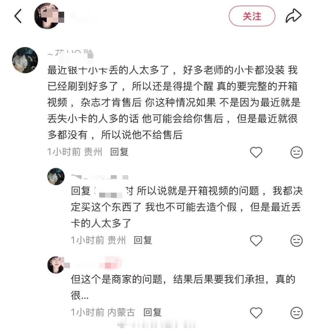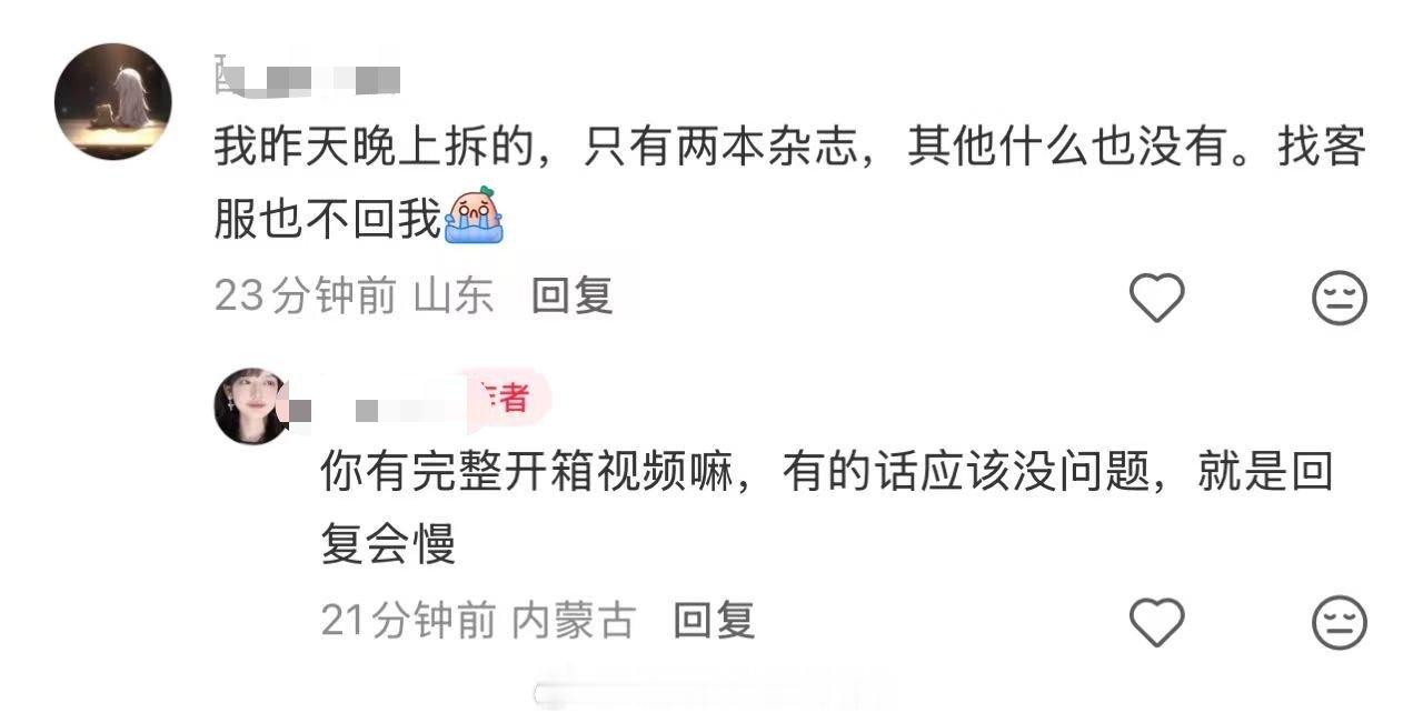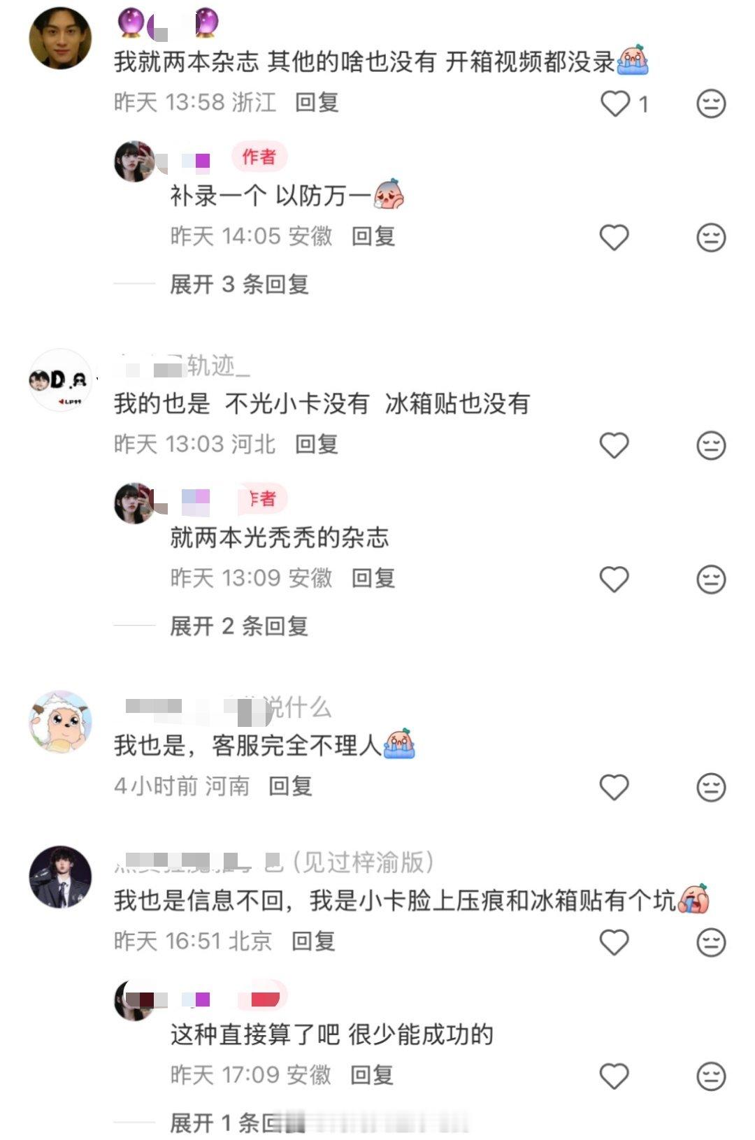 好惨的粉丝...不运回看不见明细,杂志不是没卡就是没周边,还有粉丝说收到假卡