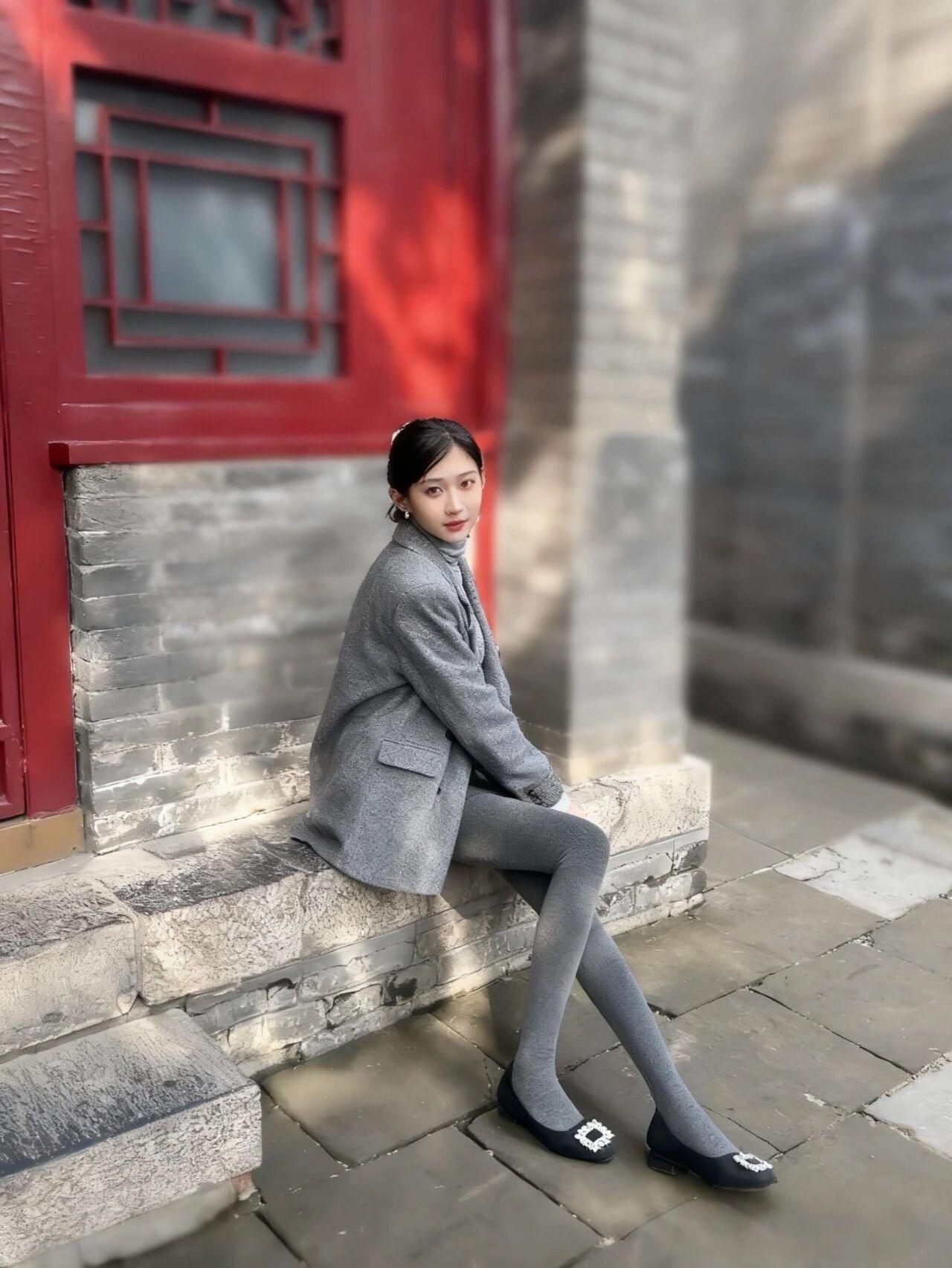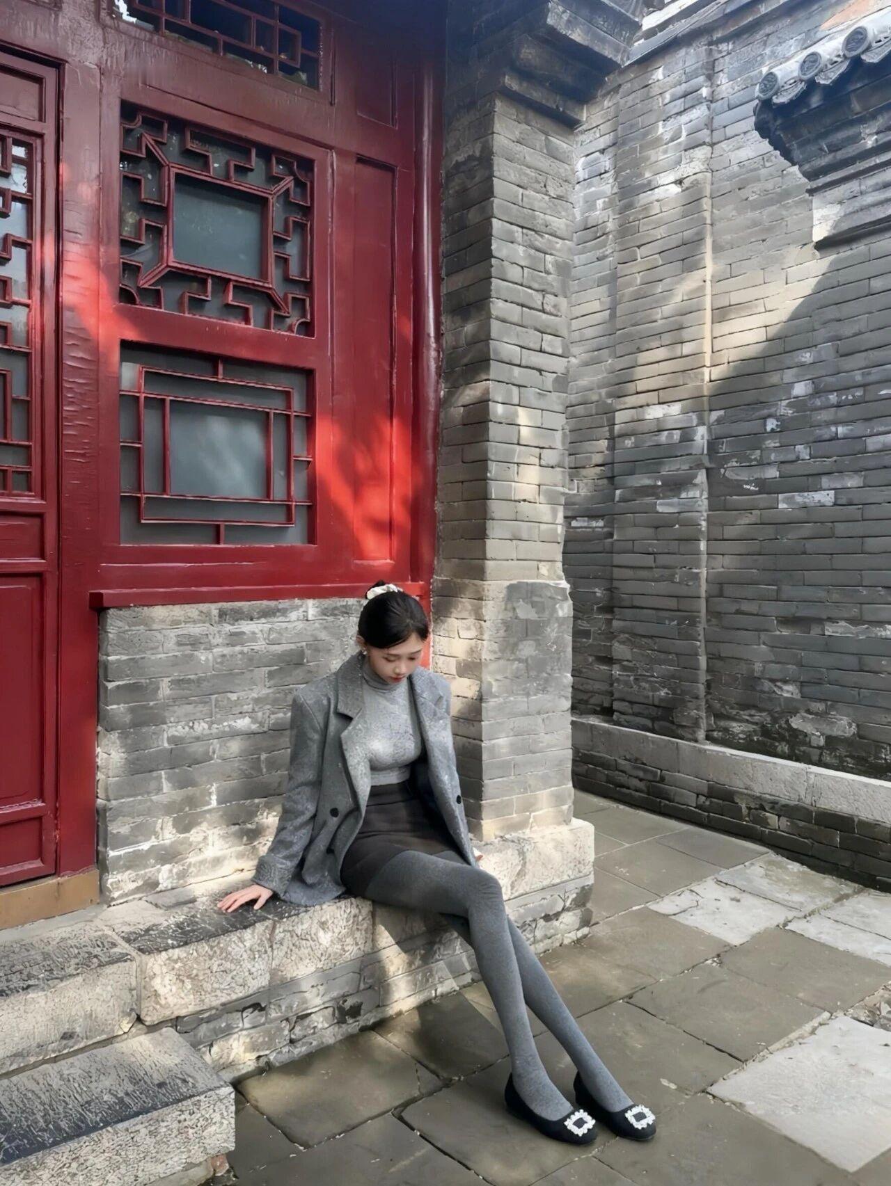 在一条铺满灰色石板的小巷深处,一面饱经风霜的红砖墙静静伫立。墙面上,一道鲜艳的红色窗框格外醒目,窗内是传统的中式窗格,像一幅画中画,将时光定格。 一位女子静静地坐在墙边的石凳上,她身着整套灰色系衣物,从高领毛衣到修身大衣,再到紧身裤,色调和谐统一,唯有脚上那双黑色平底鞋的点缀,打破了色彩的单调,鞋面上的白色装饰犹如跳动的音符,为这份沉静增添了一丝灵动。她的头发被整齐地束在脑后,露出光洁的额头和专注的眼神,目光平和地望向远方,仿佛在思考,又仿佛在等待。 红与灰的强烈对比,让整个画面充满了视觉张力,既保留了古典的韵味,又透露出一种现代的简约。阳光温柔地洒下,为这宁静的一刻镀上了一层金边,时间仿佛在这一刻静止,只剩下那抹红,那抹灰,和那份独属于小巷的静谧。