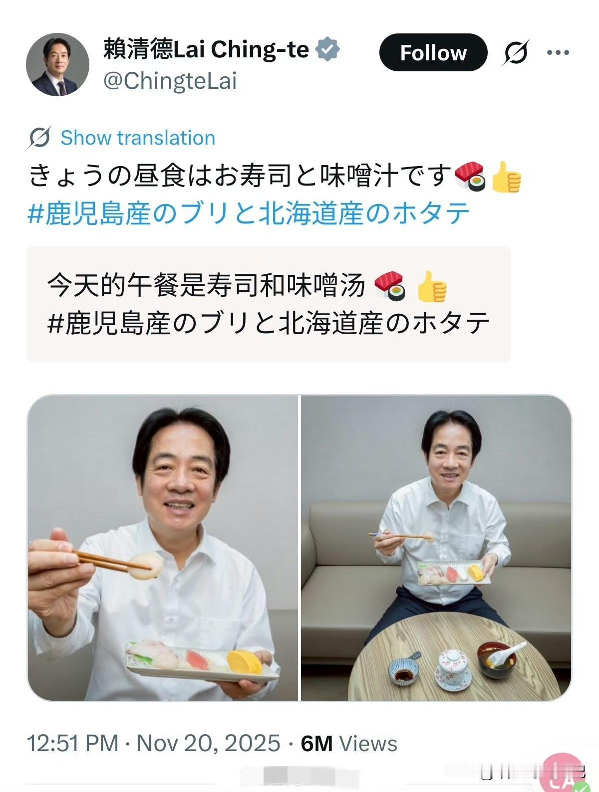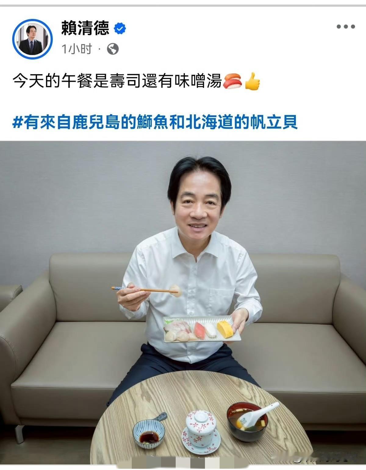 刚喊停日本水产品,赖清德就端出一盘“日文寿司”:鹿儿岛鰤鱼、北海道帆立贝,配字还是日语。这波“餐桌外交”踩点之准,连计时器都自愧不如。 日文+日料,他把午餐吃出“外交仪式感”。生鱼片旁摆着酱油小碟,配文却是日语问候。吃顿饭而已,是怕谁看不懂,还是怕谁看得懂? 经济受损、渔民喊苦,他却忙着给东京送秋波。午餐秀背后,是算盘声:拉日本当靠山,替“台独”加筹码。 生鱼片再薄,也盖不住‘倚外谋独’的刺;芥末再冲,也遮不住‘媚日作秀’的腥。历史告诉我们,数典忘祖的饭不好吃,容易噎着。。 [图源网络]