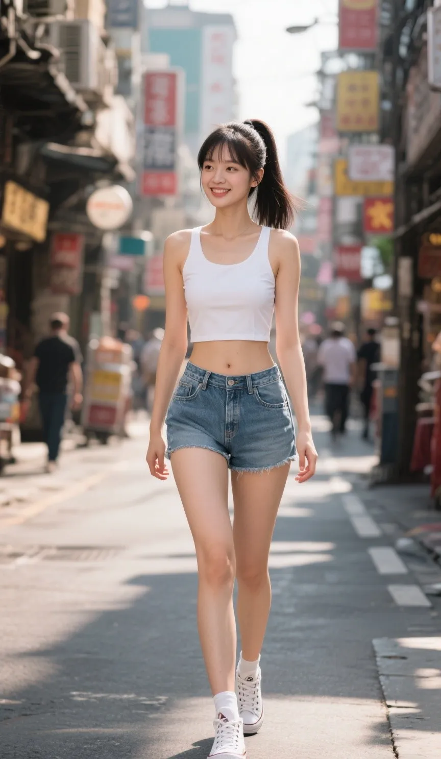 高马尾白衣美女在繁华的街道漫步,夏天的背心+牛仔短裤真的是绝配哦,清爽的夏天就应该休闲地度过。马尾白衫少女 白衣街拍女神 白t恤女孩 吊带背心的美女 辣妹热裤女 灰色牛仔短裤女