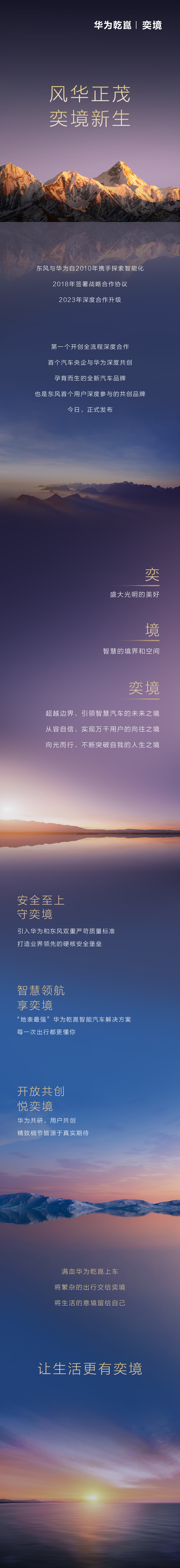 来来! 又有新料啊!在华为乾崑生态大会上,华为的三境之一“奕境”正式发布,该品牌是由东风汽车与华为乾崑联合打造的新能源汽车品牌。作为首个由汽车央企与华为深度合作打造的品牌,双方开创“联合定义、联合开发、联合办公”的全新模式,整合优势资源,瞄准高品质家庭用车市场。“奕境”是双方一个团队、百亿投入、三年深耕的战略成果。其命名源于用户共创,经过多轮创意征集与票选确定:“奕”象征光明盛大,“境”代表智慧境界与空间,共同诠释品牌致力于超越边界、实现用户向往的理念。品牌以“为家庭用户造最好的车”为使命,围绕三大核心价值构建体系:安全至上:以零起火为管控目标开发电池系统,打造行业领先的安全堡垒;智慧领航:搭载华为乾崑智驾与鸿蒙座舱等技术,构建“有思想、会学习、能进化”的智慧生命体,推动车辆从出行工具向全场景智慧伙伴升级;开放共创:建立用户深度参与机制,联合华为与用户共同打磨产品。合作层面,华为全面开放产品开发与运营体系,将IPD/IPMS运作机制、全流程质量管控标准及全球化供应链管理经验赋能“奕境”。东风则基于56年造车积淀、6000万用户需求洞察及整车制造技术,为品牌打造超级智慧工厂,并在产品细节上精益求精。东风与华为的合作始于2010年,历经多阶段深化。此次携手标志着双方合作进入2.0阶段,实现央企制造底蕴与智能科技企业的深度融合。根据规划,“奕境”首款车型将于2026年4月北京车展正式亮相,后续每年至少推出一款全新车型,构建覆盖多级别的产品矩阵,为中国家庭提供更智能、可靠的高品质出行选择。