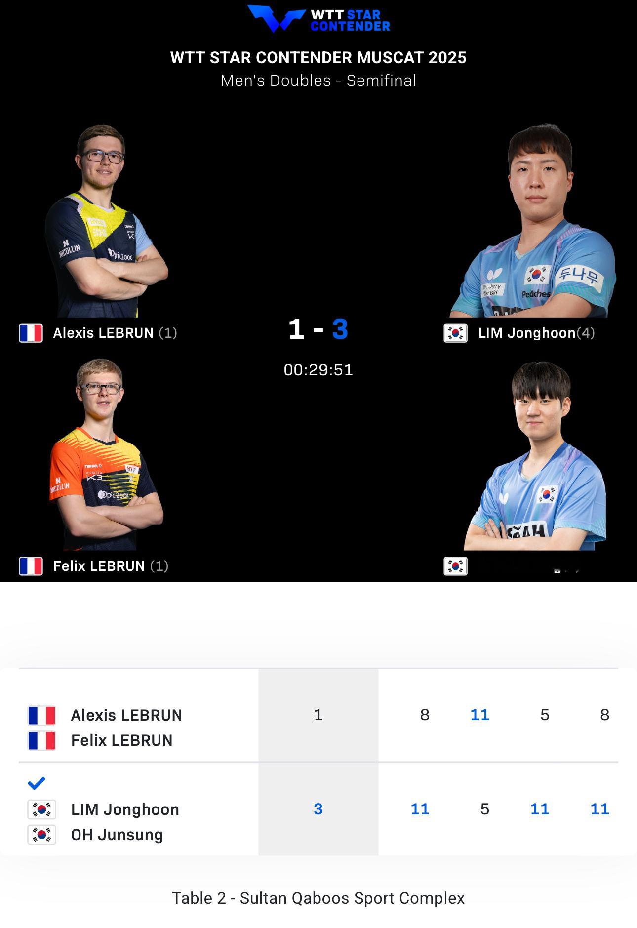 2025wtt马斯喀特球星赛男女子单打32-16F·勒布伦3-0冯翊新吉山僚一3