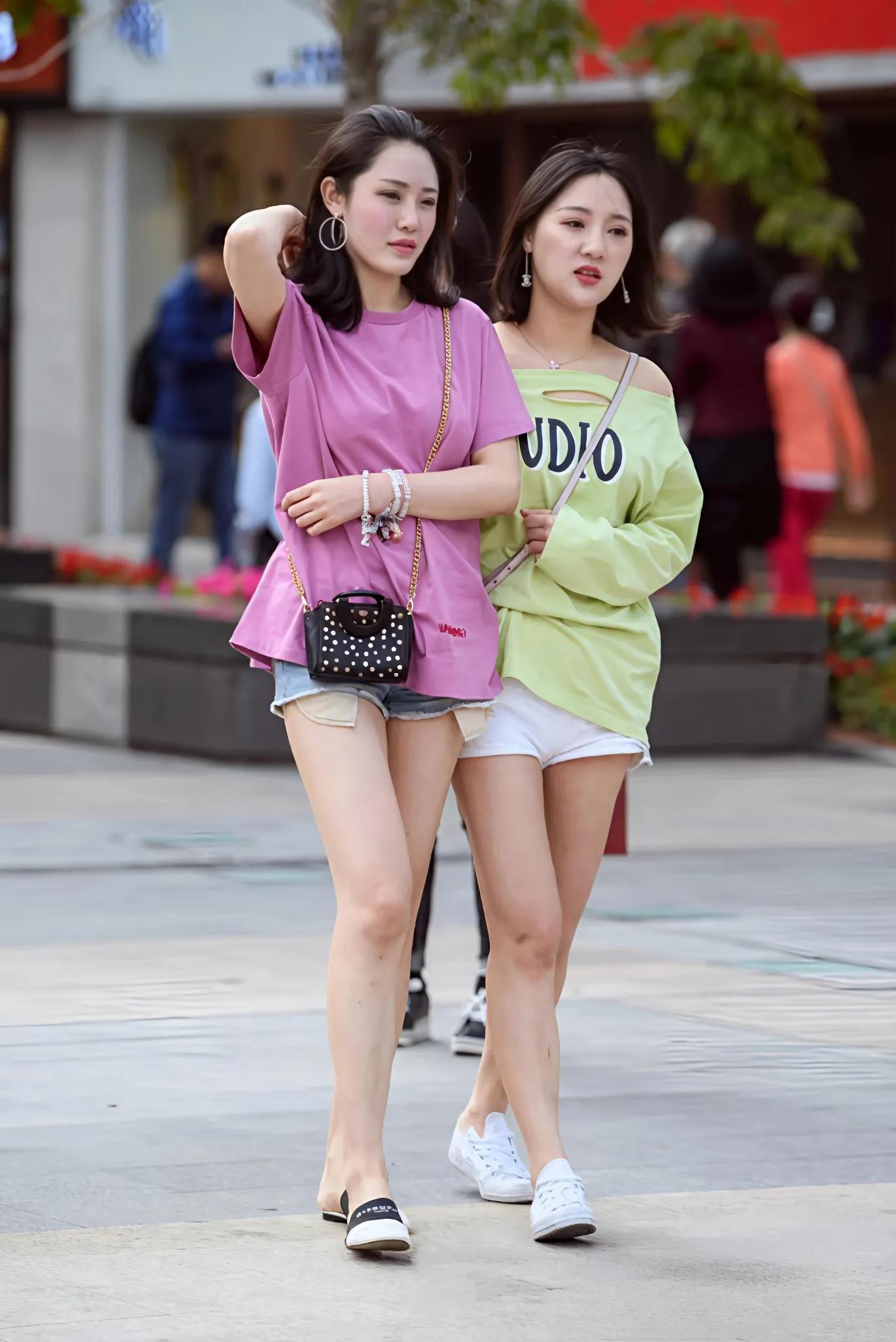 夏季穿搭:街头偶遇两位身穿大码T恤+热裤的靓丽美女,色彩鲜艳,引人注意