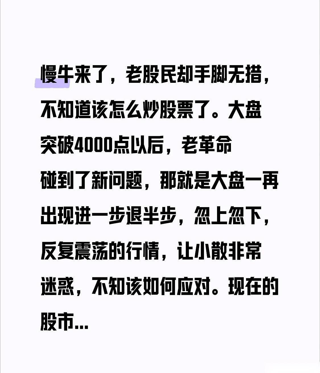 指数涨了,我的钱没涨。 甚至还亏了。 身边好几个老股民,最近都跟我说,彻底懵了,不会炒股了。 你说这是牛市吧,可你手里的票,十天半个月不动一下,跟装死似的。 大盘进一步,它退半步。 好不容易看上个热门的,追进去两天,一个回调直接把你埋在山顶上,心脏病都快给你干出来了。 一半是火焰,一半是海水。 冰火两重天,天天在账户里上演。 后来我琢磨过味儿来了。 这哪是以前那种推土机式的牛市啊,一口气上五楼,然后直接跳下来。 这叫“慢牛”。 人家压根就没想让你一口吃成个胖子。 就是要慢慢磨,把你那颗想一夜暴富的心,彻底磨平了。 以前我们是赌徒,追求的是心跳。 现在市场逼着我们当个“农夫”,得有耐心,得学会“小步快跑”,捞着一点就收兜里。或者,干脆就死磕一只好股,跟它耗个三年五载,赌时间的复利。 说真的,这可能才是好事。 一个疯涨疯跌的市场,最后都是一地鸡毛。 一个稳稳当当、慢慢悠悠往上爬的市场,才能让真正的好公司长出来,也才能让我们普通人,安安稳稳地赚点辛苦钱。 就是这个适应的过程,太折磨人了。 真的。