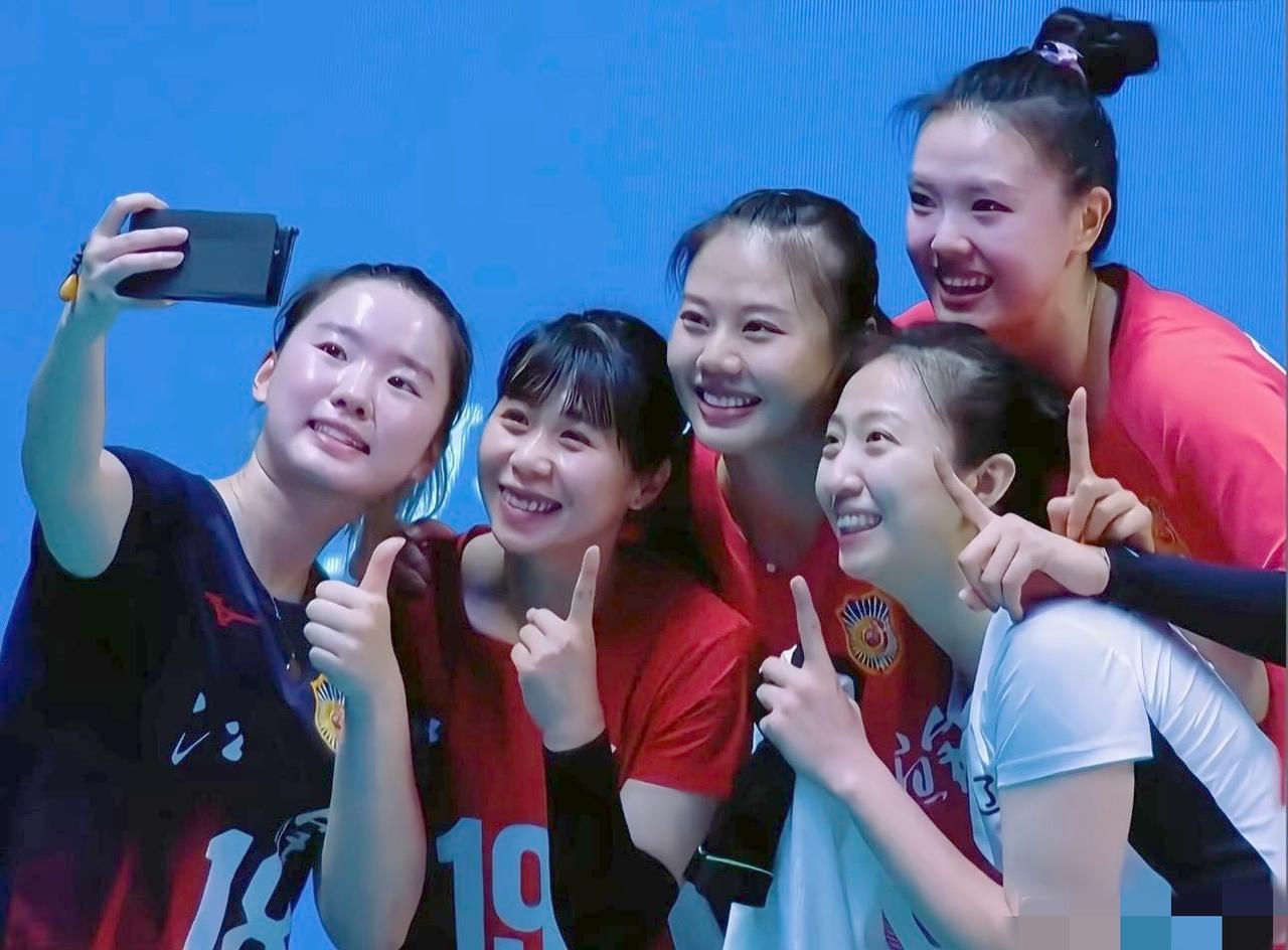 5位女排名将合照:我只认出了龙眉凤目的龚翔宇,喜笑颜开的丁霞与玉颜如春的张常宁,拿着手机竖着大拇指的是倪非凡吧?那位头发覆额的红衣姑娘是谁?