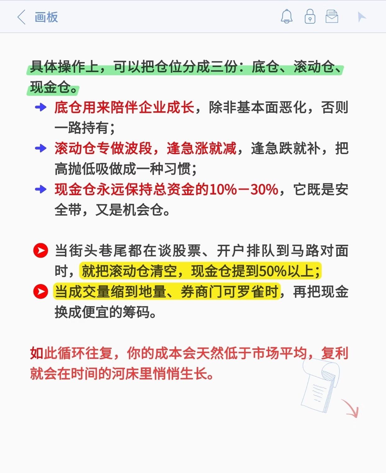围绕股票大涨时的减仓策略与仓位管理智慧,核心要点如下: 1. 为什么大涨时要减仓?再牛的股票,90%时间在震荡/回撤,真正大涨的时段极少,此时应抓住机会减仓。减仓≠看空后市,而是承认市场波动的不确定性——凌厉上涨往往靠基本面、流动性和情绪三股力量共振驱动,任一力量减弱都可能引发回调。 2. 如何科学管理仓位?建议将仓位分为三部分: - 底仓(长期持有,除非基本面恶化不轻易动); - 滚动仓(做波段,急涨减、急跌补,养成高抛低吸习惯); - 现金仓(始终保留总资金10%,市场过热时提升至50%以上作“安全带”和机会准备)。通过动态调整(如市场狂热时降仓、低迷时加仓),可让持仓成本低于市场平均,实现复利增长。 3. 减仓的具体技巧与深层逻辑 - 节奏:用“倒金字塔”分批卖出(越涨越卖,如涨5%卖1成、再涨5%卖2成),避免一次性清仓;提前写好“交易剧本”(明确止盈、回撤、回补点位),减少情绪干扰;留100股“观察仓”保持对股票的敏感度,防卖飞;及时转出利润或换低波动资产,确保盈利“落袋为安”。 - 本质:投资需对抗人性——群体亢奋时(如全民炒股)主动收缩仓位攒现金,群体绝望时(如市场冷清)大胆加仓攒股票,这才是长期存活并盈利的核心竞争力。 一句话提炼:大涨时减仓是资金管理的核心,通过分仓策略+科学减仓技巧+逆向人性操作,才能在波动市场中稳健积累复利。