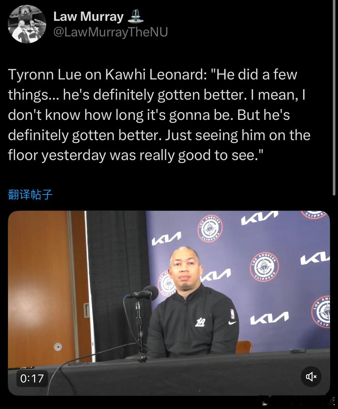 今天快船对阵魔术,伦纳德将连续第9场缺阵。泰伦卢表示,“他肯定有在好转,我不知道他整个过程需要多长时间,但他确实有在进步,昨天看到他回到球场真是太好了。”过去8场比赛,快船战绩1胜7负。