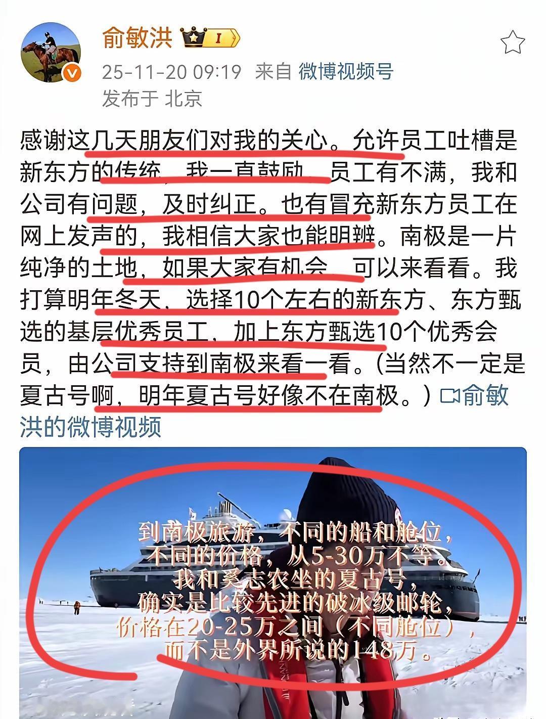 俞老师跟他的摄影师去南极考察,一个人25万左右!当他发出全员信后,引发舆论的海啸,俞老师本来是想谈谈自己创业激情澎湃的岁月,自己创业的艰难,本质是励志一下,老男人都喜欢这个,但这碗鸡汤太浓了,打工的牛马可不受补,直接吐上火了~ 以至于他俞老师大骂一顿,员工都坐不住了,专门模仿俞老师写了长文谈加班的感受,这一刻,我们都是南极人! 眼看成了史上最大的翻车事故,终于,他又出来道歉了,这一点还是很好的,知错就道歉,但永远不改! 他在文中承诺,明年冬天,他会选择10个优秀员工,10个优秀会员一起去南极体验一把,公司全部报销费用!你觉得,一个公关举措如何呢,能挽回俞老师的形象损失么?