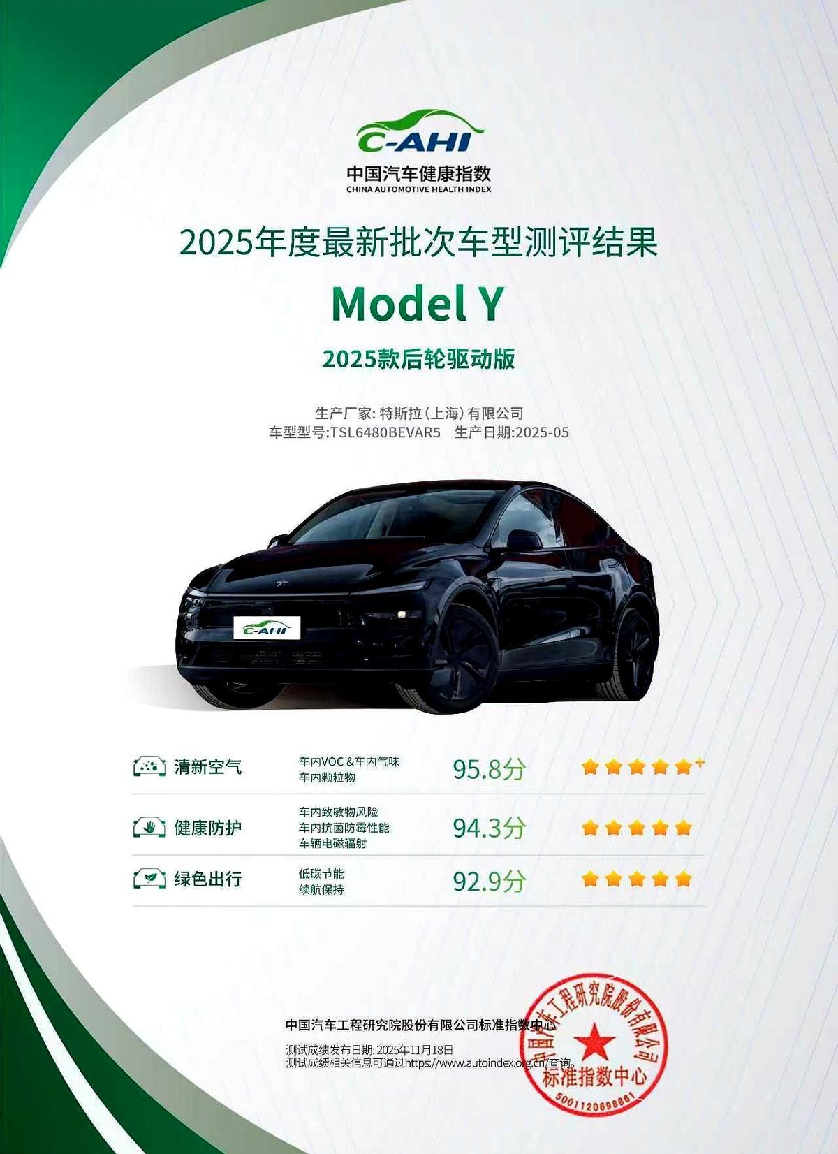Model Y获中国汽车健康指数“五星健康”认证。 在2025年度车型测评中,Model Y在清新空气、健康防护、绿色出行方面,均获得“五星健康”认证。 虽然中汽研是五星批发部,别的车可信度得打折,但是特斯拉可以相信! 感觉刚提的 YL 比四年前提老 Y 的时候味道大一些。 这什么单位,这不是什么有限公司吗,你花钱买的第一啊?你不会起诉我吧。 大哥,第一条别写出来行不行?强者不拘“小节”。你变了。
