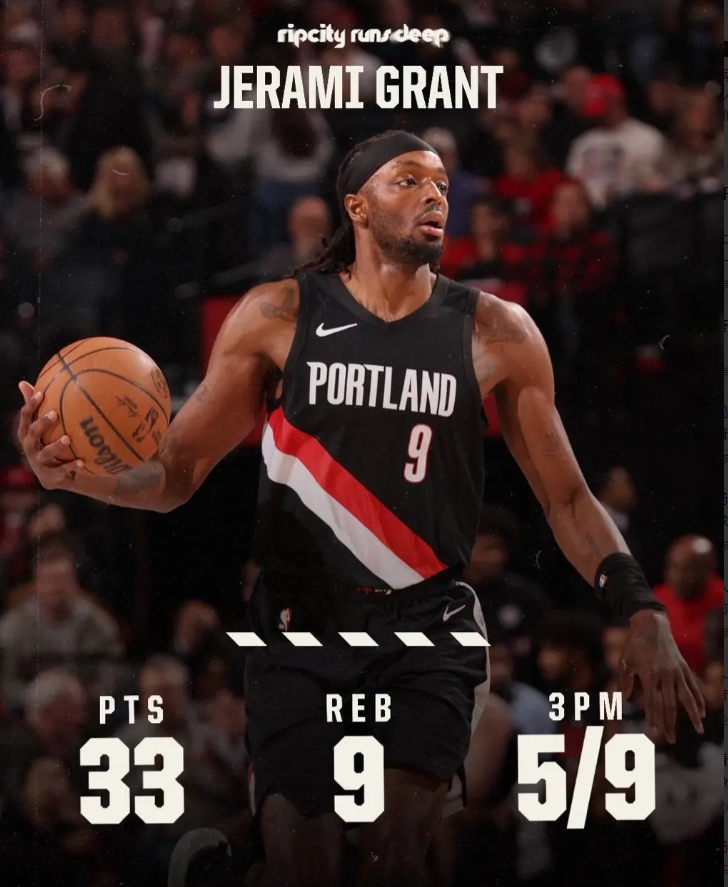 昨日NBA常规赛开拓者主场对阵公牛的比赛已经结束。全场战罢,开拓者以121-122不敌公牛。 本场比赛,开拓者球员杰拉米-格兰特出战36分钟,18投10中,其中三分球9投5中,罚球10投8中,空砍33分9篮板4助攻。 赛后,开拓者社媒分享本场比赛格兰特数据海报:获得赛季得分新高33分。