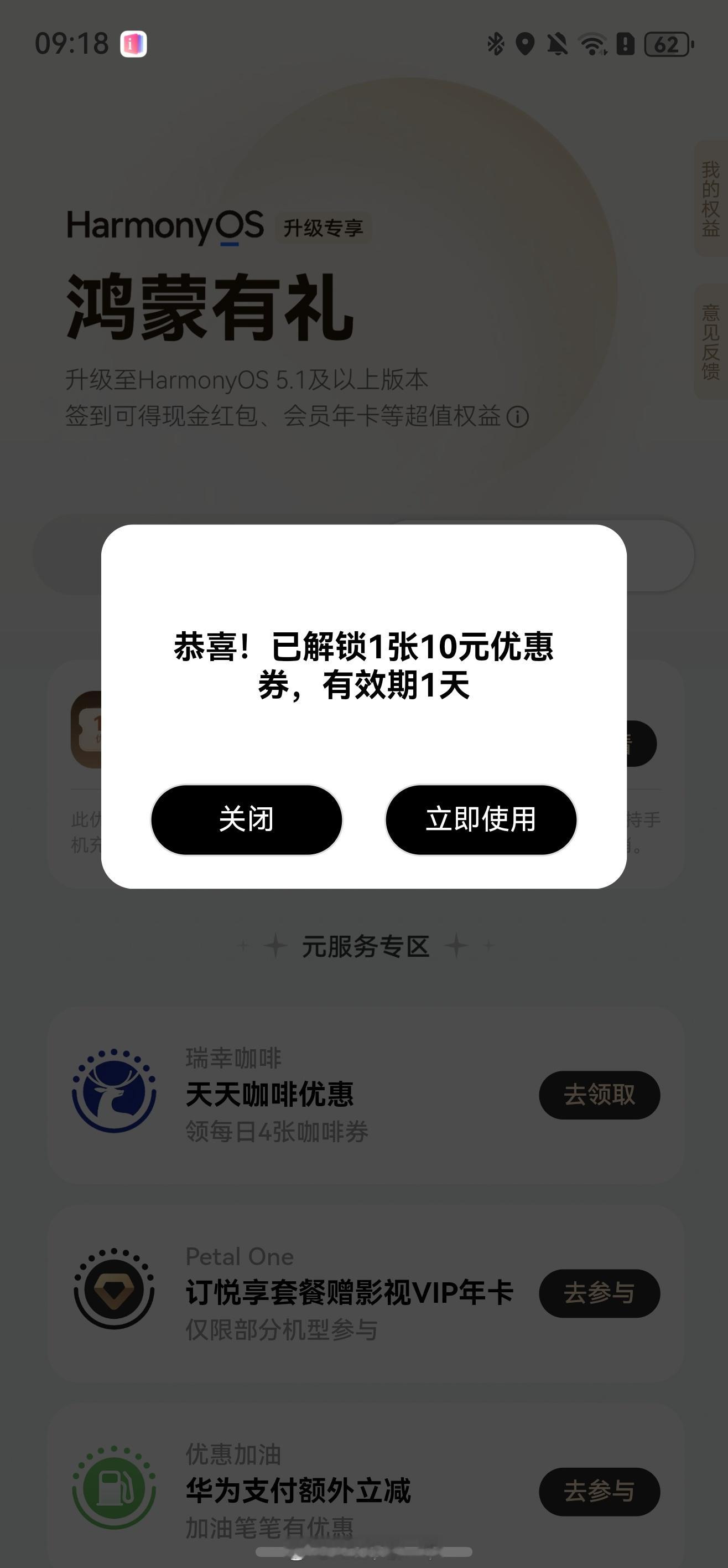 今天的鸿蒙有礼还有10块钱的券,大家可以喝喝咖啡,可惜今天不能充电费