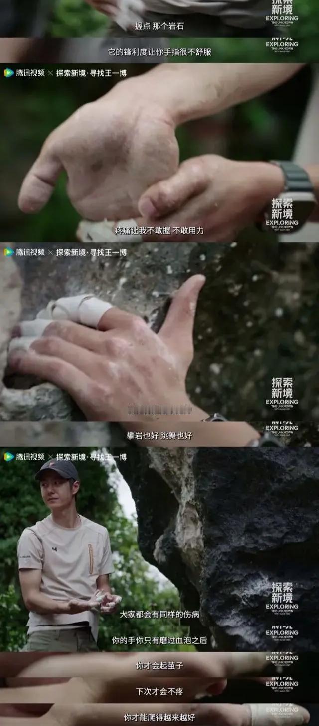 王一博以前的手p7-p9 王一博现在的手p1-p6 一切尽在不言中,就像王一博做事,“我在努力活出生命的极致”,骨节逐渐变大满是伤痕却越来越有力的大手,是王一博认真投入热烈自由让生命不断绽放光彩的见证。 “让自己更活的像一个真实的人吧” “找到了自己想要做跟喜欢做的事情,也就是攀岩,所以第二季我要去攀岩” 王一博