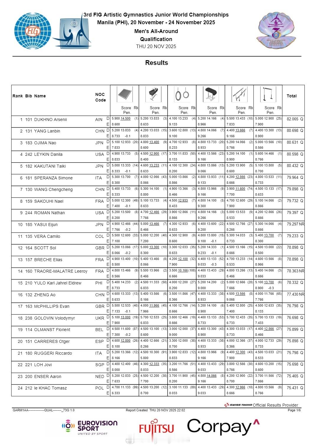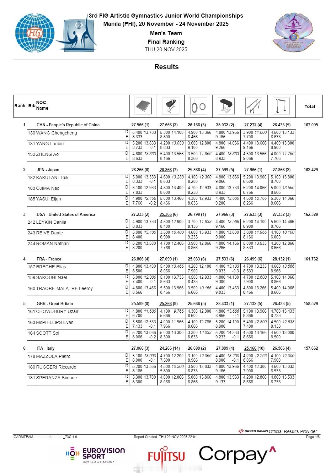 【体操世青赛中国首夺男团冠军】 11月20日马尼拉,2025年体操世青赛结束男子团体比赛。由杨兰斌、王呈丞和郑奥组成的中国队在第一项单杠慢热,但之后发挥稳定,以163.095分夺得中国首个男团冠军。日本和美国分获银铜牌。在男子个人全能资格赛中,俄罗斯选手杜赫诺高居榜首,杨兰斌和王呈丞排名第二和第七晋级。此外,中国小将在自由操、鞍马、吊环和双杠单项上都进入了决赛。