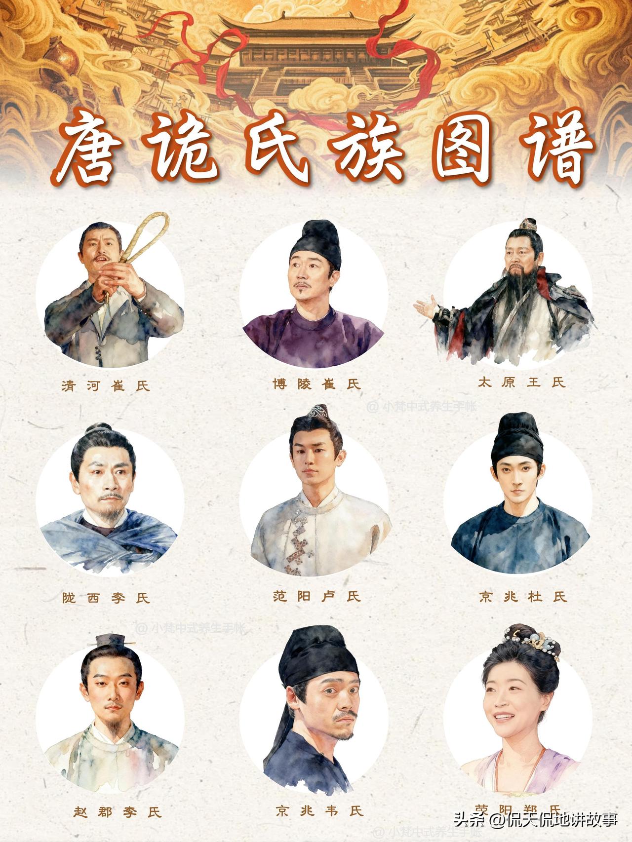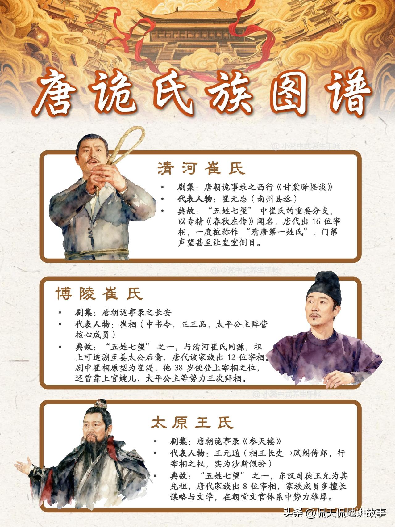 别光看探案!剧中崔氏、郑氏、李氏、王氏、卢氏的家族较量,藏着唐朝氏族的真实格局。先厘清一个关键知识点:河东裴氏不属于五姓七望,而是关中六姓(韦裴薛柳杨杜)核心,虽社会名望不及五姓七望,但唐朝出了17位宰相,东眷裴就占6位,“无裴不成唐”的说法绝非虚传。 五姓七望才是当时的名门天花板,尤以崔卢为首,且氏族间联姻不断,堪称“六朝何事,只成门户私计”。剧中崔相属博陵崔氏,还有唐朝诡事录 第一季的崔无忌刚出场时嚣张跋扈,结果悄无声息被杀,反差感拉满;琅琊王氏在唐朝出了4位宰相,从未被灭族,而太原晋阳王氏被刘裕灭族后,唐朝仅出1位宰相,太原祁县王氏更是消失200年,后世多为冒牌货。至于关中六姓,“京兆韦杜,去天尺五”的说法彰显其地位,韦杜两家更是当时的顶级豪门。 那么问题来了,唐事诡事录 里崔氏、郑氏、李氏、王氏、卢氏,你觉得哪家氏族的实际地位最高?来评论区聊聊你的看法!