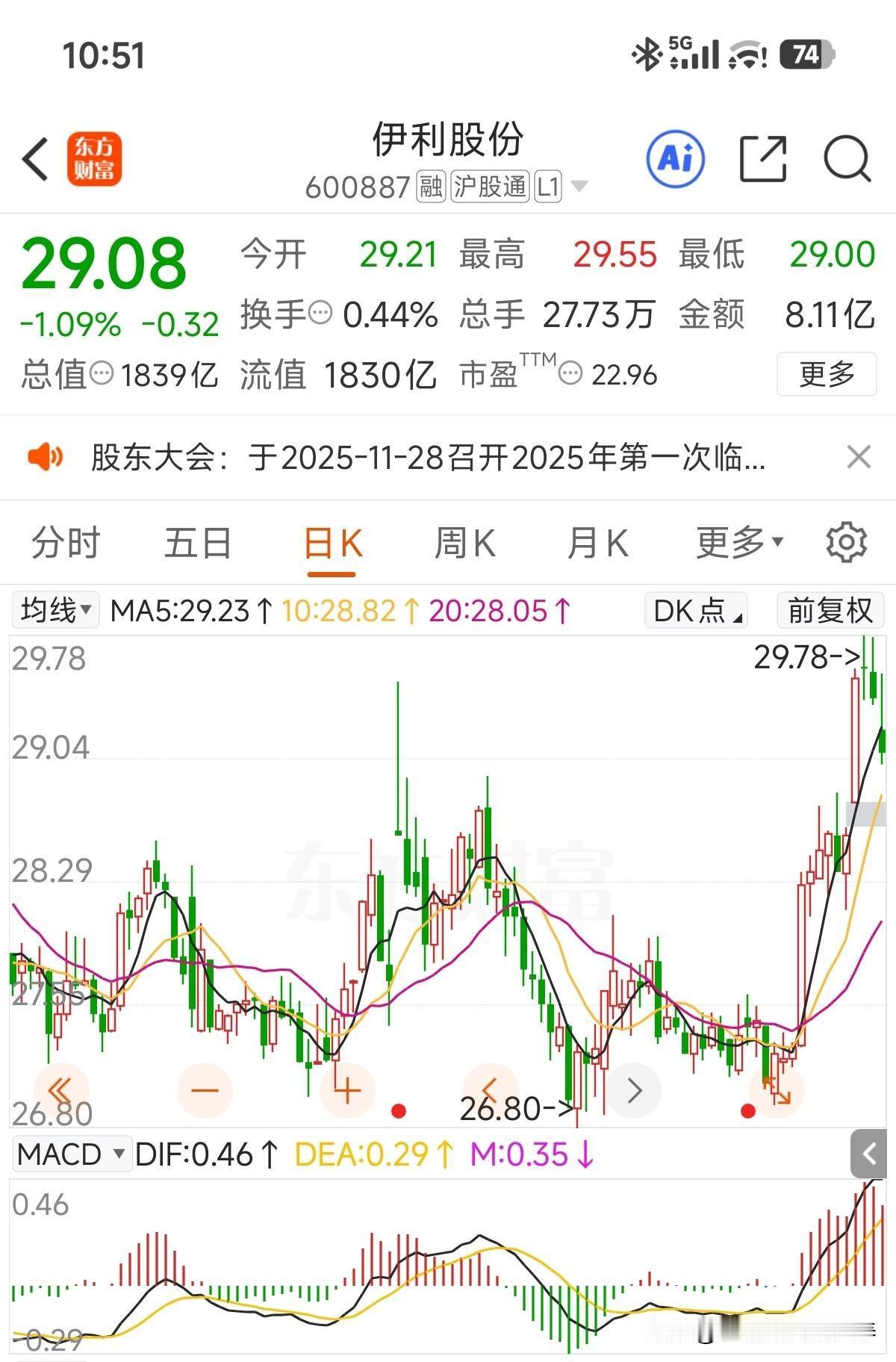 今年的走势很有规律,一份财报出来跳空高开下然后继续调整,这次是一份投资者回报规划公告再次跳空高开后又开启调整! 反应到股价上面,今年前后不下10次冲击29-30区间,又开启回调,前几天冲击该位置也提示了不适合追!当然30元相信不会是伊利的天花板,这位置最终会冲过去!需要的只是时间!