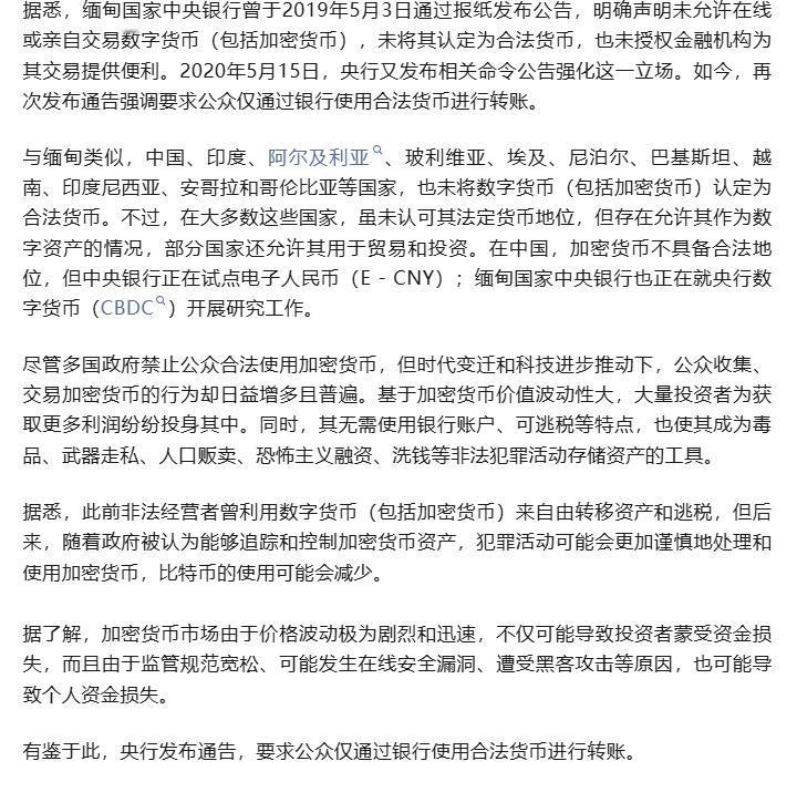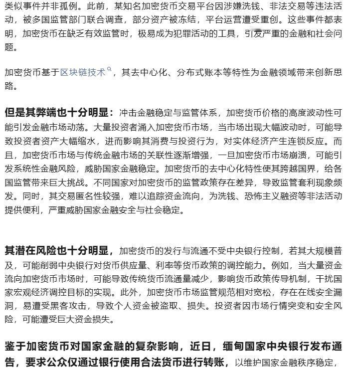 太子集团被没收价值150亿美元的比特币,对缅甸上下的刺激很大!缅甸军政府要求全体公众,只可以通过银行,使用合法货币进行转账。严禁使用加密货币来进行交易,因为不具备安全属性,随时可能被没收,所以才会要求缅甸民众注意。尤其是的缅甸的网络公司,此刻估计吓怕了,资产随时会被带走! 其实太子集团的遭遇,让缅甸的这些网络公司的头目,以及那些私人武装的大小军阀,都是有非常大的震撼的。因为加密货币再也不安全了,随时都会被以各种名义查扣,再也讨不回来。虽然太子集团在美国上诉,试图讨回属于自己的财产。但是在博主看来,几乎是不可能要回来的。 另外这些缅甸的加密货币,肯定有很多人持有,他们现在估计都得纷纷抛售,因为一旦被查到加密货币的踪迹,那么立刻就被没收了。辛辛苦苦挣来挣来的所谓的不义之财,瞬间就归零了。所以现在缅甸方面非常重视,无论你是合法的,还是不合法的加密货币,都不能持有,因为随时都不会再属于你的财产。 不管怎么说,在博主看来,加密货币确实不那么安全,缅甸方面做出这样的劝告,其实很正常。就是让缅甸民众,守好自己的财产,尽量不要去搞那些不受自己控制的加密货币,因为随时会被拿走的。 缅甸方面的各个大小公司和大小武装,肯定是有人用的加密货币,尤其是什么比特币,狗狗币,以及一些所谓的其他加密货币,都不是安全的避风港。