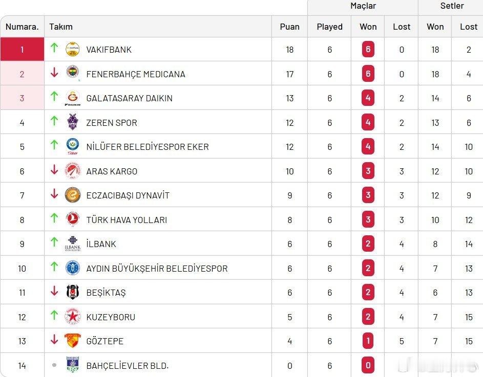 【土超积分榜—银行榜首,伊萨第七】 瓦基弗银行、费内巴切、都是六胜,排名前二加拉塔萨雷、泽仁体育三到四位巴赫切利耶夫勒六战全败垫底伊萨奇巴希三胜三负第七位