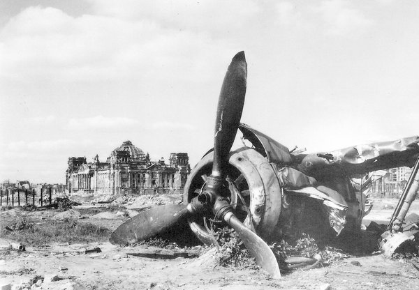 1947年的照片,德国国会大厦前的Fw 190战斗机残骸。 感觉国会大厦跟个百宝箱似的,周围什么东西都有。这架飞机翻倒在地,肚子朝上,螺旋桨还很完整,应该不是从天上掉下来的。看螺旋桨上缠绕的钢缆,可能有什么人曾试图拖行它,拖不动的时候就扔这儿了。