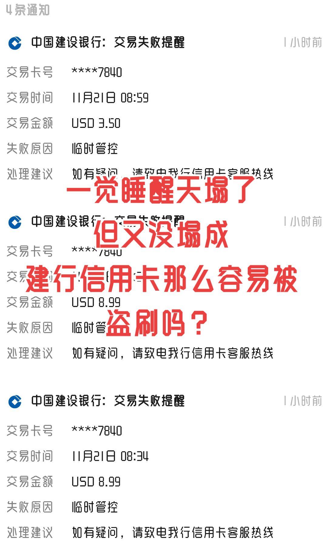 这两天建行的信用卡频繁被盗刷,一会英镑一会澳元一会美元……每次刷的都是小额的。 真是服了,得亏先前被刷英镑的时候就把卡冻结了,要不然后面的损失就大了,虽然每次刷的都是小额外币的,但积累起来也已经好几百RMB了,这张卡看来是不能要了。 劝解大家不要办全球通类的支付卡,这种卡不需要密码,能直接刷。安全性太低了。 日常分享 记录一下