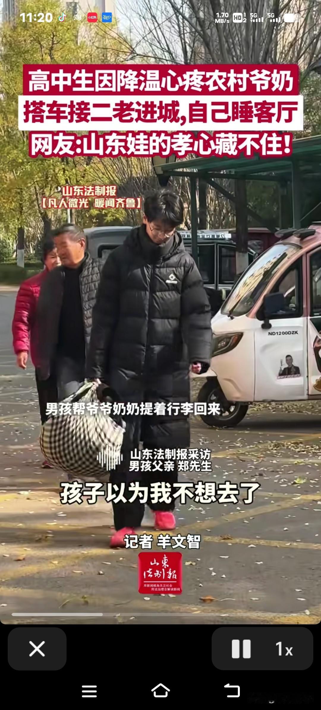 最近刷到一个特别暖的真事儿:山东济宁有个17岁的高二男孩,周末悄悄打车把乡下的爷爷奶奶接到了城里住。这背后的原因,看完真的让人心里一热。 这孩子平时在学校住校,一周就周五能回家。前几天刷天气预报,看到这两天要降温,心里就开始惦记起乡下的爷爷奶奶——他们冬天一直用煤球炉子取暖,晚上烧着煤球,总怕有啥不安全的。孩子周末一到,啥也没多想,直接打开打车软件,自己就往十几里外的老家赶了。 他爸爸本来打算周一有空再亲自去接,结果周五放学回家,发现儿子早就自己安排好了,爷爷奶奶已经坐着儿子的车到城里了。爸爸又惊又暖,摸着儿子头说:"儿子,你这比我想得周到多了!" 其实这孩子一直挺懂事的。往年冬天爷爷奶奶来城里住,他都只能在客厅搭个简易折叠床睡。这次为了让老人住得踏实,哪怕自己要在学校请假、来回折腾,也非要早点把人接过来,说"这样晚上烧煤我也能盯着点,放心"。 网友们看到这事儿,都在评论区夸:"肯定是爷爷奶奶平时把爱都给足了,才能养出这么贴心的娃啊!"这让我想起一句老理儿:孝顺从来不是等"有空再说",是心里时刻装着,用行动赶紧做出来的。你家孩子有没有过让你又意外又感动的小举动?评论区聊聊呀~