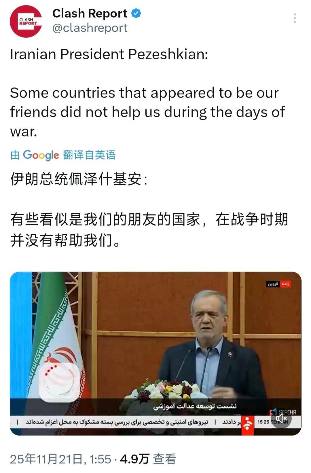 就在今天 伊朗总统佩泽什基安发文表示! 11月21号,伊朗总统佩泽什基安的一番表态引发热议,他公开表示“有些看似是我们朋友的国家,在战争时期并没有帮助我们”。 这番话乍一听像是在控诉盟友“不讲义气”,但仔细琢磨就会发现,事情根本没那么简单,佩泽什基安的指责不仅站不住脚,反而暴露了伊朗自身的诸多问题。 首先说,国与国之间的盟友关系,从来都不是单方面的“索取”,是基于共同利益的相互扶持。 可伊朗如今抱怨别人不帮忙,却压根没反思过自己的处境到底是怎么来的。 目前的伊朗,国内安全局势堪称严峻,被以色列渗透得防不胜防,安全防线几乎形同虚设。 这可不是外人造成的,核心还是自身治理出了漏洞——情报系统反应迟缓、内部管理存在短板,才让对手有了可乘之机。 自家大门都守不住,就算盟友想帮忙,恐怕也得先考虑自身的安全风险,毕竟没有哪个国家愿意为一个连自己都保护不好的伙伴贸然出手。 更让人看不懂的是伊朗在外交和战略上的短视操作——贸然疏远叙利亚阿萨德政权。 要知道,阿萨德政权一直是伊朗在中东地区重要的地缘政治盟友,两国在诸多领域有着深度绑定,叙利亚更是伊朗制衡地区对手的重要支点。 可伊朗却偏偏在关键时期选择“放弃”这个盟友,这种不顾长远利益的决策,让自己在中东的战略布局出现重大缺口,更寒了其他盟友的心。 试想一下,连长期绑定的伙伴都能轻易舍弃,其他国家看到这一幕,怎么可能还敢对伊朗百分百信任? 盟友之间最看重的就是“靠谱”二字,伊朗自己先打破了这份信任基础,又怎能指望别人在关键时刻“雪中送炭”? 再看所谓的“朋友国家”,就拿俄罗斯来说,之所以对伊朗心存疑虑,完全是情理之中。 谁愿意和一个治理混乱、战略摇摆的国家深度绑定? 伊朗一边想让盟友在危难时伸出援手,一边又在自身行为上毫无顾忌,不修补国内的安全漏洞,又不珍惜来之不易的盟友关系,这样的行事风格,很难让人将其视为“值得信赖的伙伴”。 其实国与国之间的交往,就像人与人之间的相处,你得先做好自己,才能赢得别人的尊重和帮助。 伊朗目前不反思自己的问题,反而把责任推给别人,这种“甩锅”行为自然得不到认可。 佩泽什基安或许觉得伊朗是“受害者”,但实际上,真正阻碍伊朗获得支持的,正是它自己。 国内被渗透暴露的治理短板,战略决策上的短视失误,以及对盟友关系的轻率对待,这三点加起来,才让所谓的“朋友”不敢轻易施以援手。 如果伊朗不能正视这些自身问题,只是一味地指责别人“不帮忙”,恐怕未来只会陷入更孤立的境地。 说到底,国与国之间没有永恒的朋友,只有永恒的利益,但利益的维系离不开相互的信任和自身的硬实力。 伊朗想要在关键时刻获得支持,与其抱怨盟友“不够意思”,不如先静下心来修补自身的漏洞,珍惜身边的盟友关系,用实际行动证明自己的可靠性。 否则,再怎么吐槽“朋友不帮忙”,也只是徒劳无功的自我辩解罢了。 各位读者你们怎么看?欢迎在评论区讨论。