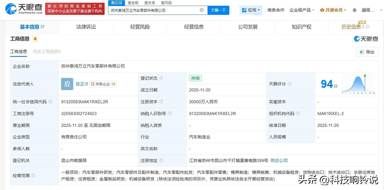 【泰鸿万立在苏州成立汽车零部件公司 注册资本3亿】 天眼查App显示,近日,苏州泰鸿万立汽车零部件有限公司成立,法定代表人为应正才,注册资本3亿人民币,经营范围包括汽车零部件研发、汽车零部件及配件制造、汽车零配件批发、模具制造等。股东信息显示,该公司由浙江泰鸿万立科技股份有限公司全资持股。 天眼查信息: