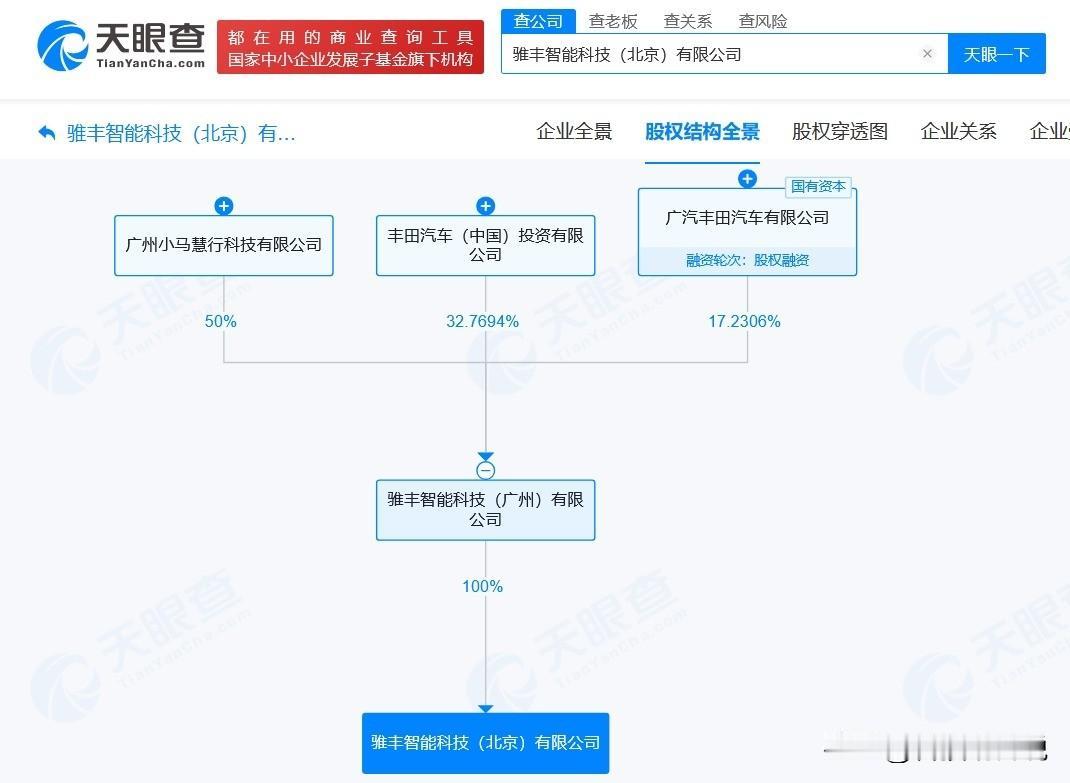 【丰田小马智行合资公司在北京成立新公司 注册资本6800万】 天眼查工商信息显示,近日,骓丰智能科技(北京)有限公司成立,法定代表人为李林涛,注册资本6800万人民币,经营范围含机械设备研发、智能仪器仪表制造、智能仪器仪表销售、企业管理咨询、机械设备租赁、汽车零配件零售、智能输配电及控制设备销售、人工智能基础资源与技术平台等。股权全景穿透图显示,该公司由骓丰智能科技(广州)有限公司全资持股,后者由广州小马慧行科技有限公司、丰田汽车(中国)投资有限公司、广汽丰田汽车有限公司共同持股。 天眼查信息: