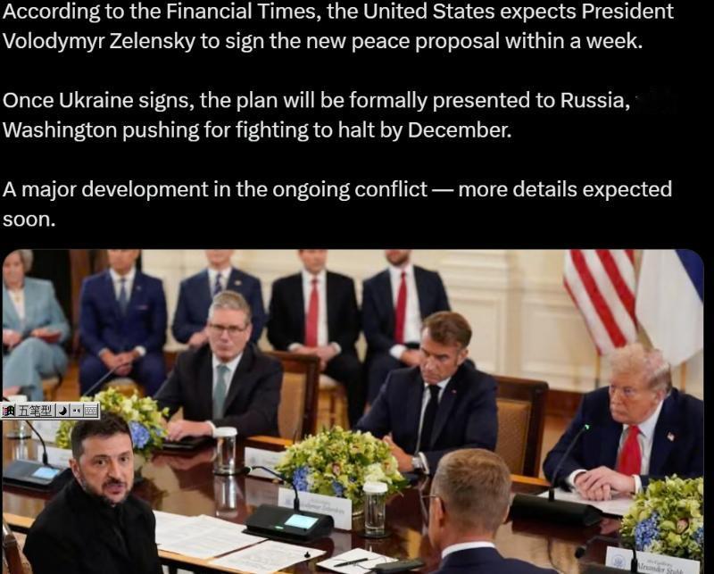 重磅:俄乌将在12月前停战 英国金融时报报道,美国预计乌克兰总统泽伦斯基将在一周内签署新的和平方案。乌克兰签署后,该方案将正式提交给俄罗斯,华盛顿将敦促双方在12月前停止战斗。 这是俄乌冲突的一项重大进展——预计很快就会公布更多细节。 据美国全国广播公司报道,美国总统特朗普本周已批准旨在结束俄乌冲突的“28点”计划,主要涵盖乌克兰的和平与安全保障、欧洲安全、未来的美俄关系以及美乌关系等四个方面。 俄罗斯总统新闻秘书佩斯科夫表示,关于该计划,俄方没有消息可以提供。 现在,乌克兰总统已经表态。 泽连斯基说,美方提出了基于美国愿景的结束战争的计划要点,乌方谈了自己的关键原则。双方一致同意着手落实这些要点。乌克兰、美国、欧洲和全球伙伴已做好准备,进行清晰坦诚的工作。 这场持续将近四年的战争,再次迎来曙光。