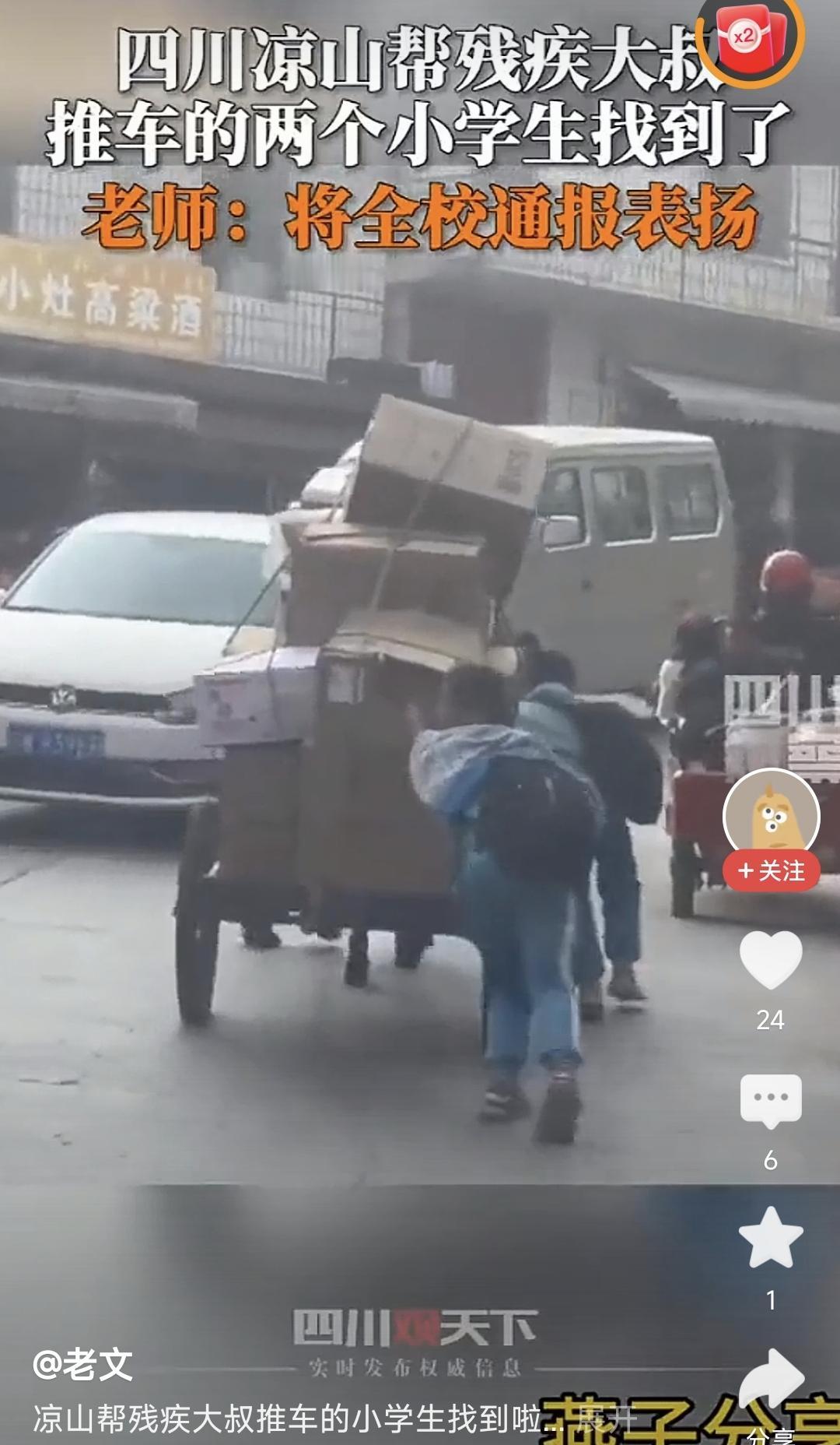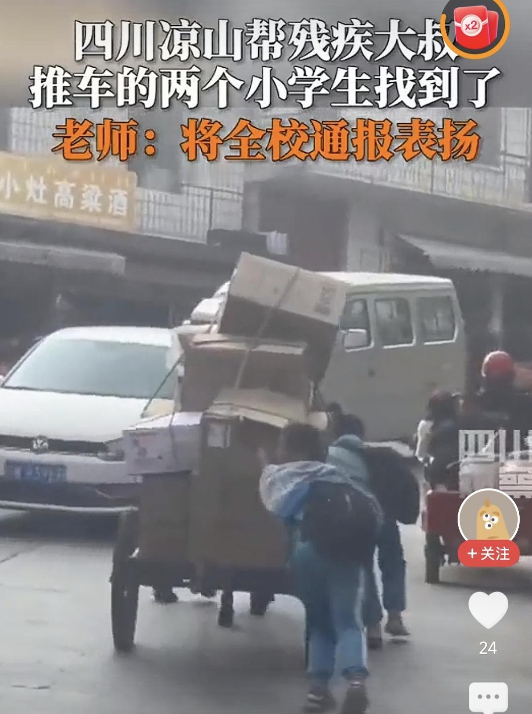 四川凉山两个孩子在上学的路上,看到一位残疾人大叔拉车上坡,两个孩子立刻跑上去,在后面帮助残疾人大叔推车。这一幕被路人用手机拍摄下来上传到网上,网友纷纷点赞,学校也表示将对两个孩子全校表彰。 确实应该表扬,尤其是现在,更应当弘扬这些助人为乐的精神。相信70后一代人看到这个视频,心中颇有感慨。我们读书那个年代,帮助老人帮助小孩帮助有困难的人,就是非常普通的事情,非常正常的事情,几乎所有学生都会做的事情。助人为乐,拾金不昧,是刻在骨子里面的品德教育,绝大部分人都会坚守这份道德底线。 重温这些教育,真的很有必要。教育