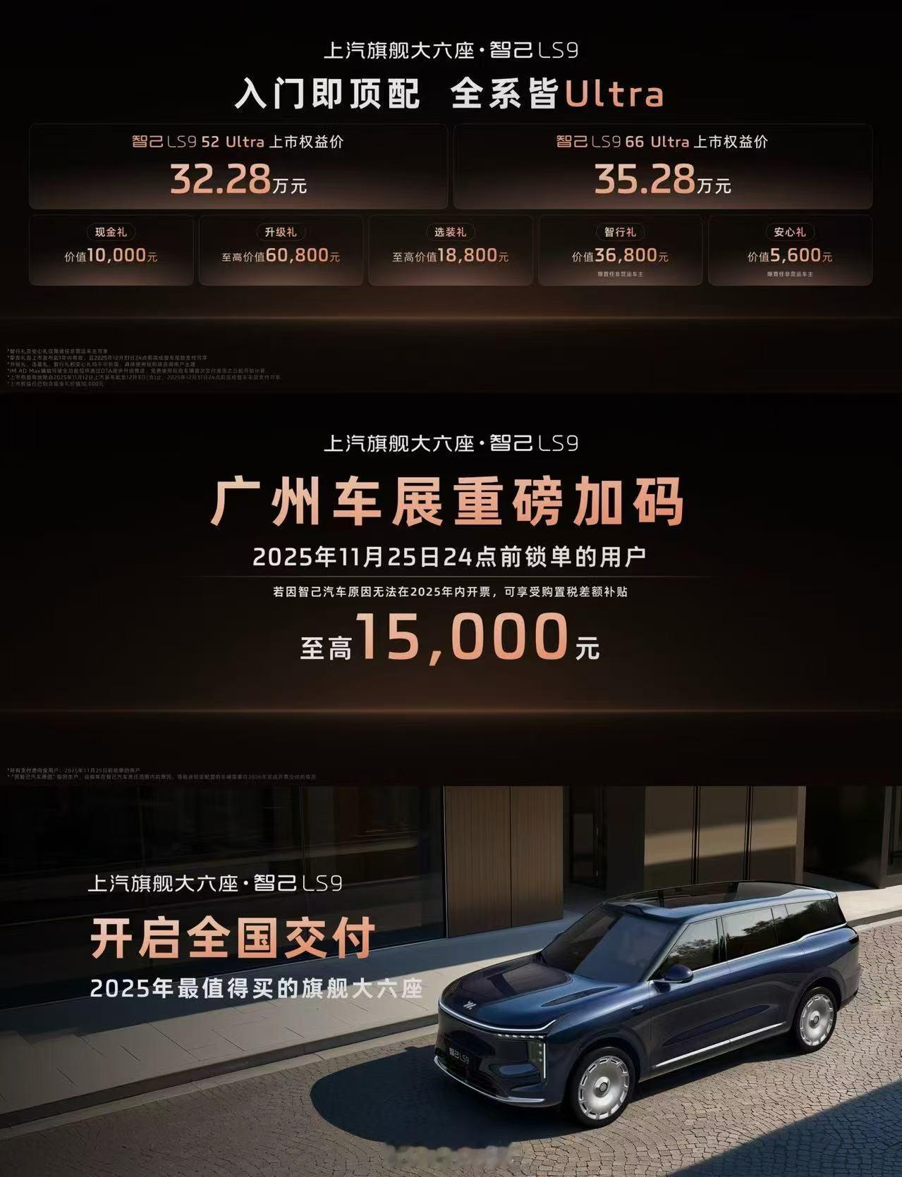 广州车展,智己公布LS6和LS9限时权益价格。LS6:19.79—26.99万元。LS9:52 Ultra版:32.28万元(52kWh电池,CLTC纯电续航320km,综合续航1454km)。66 Ultra版:35.28万元(66kWh电池,CLTC纯电续航402km,综合续航1508km)。