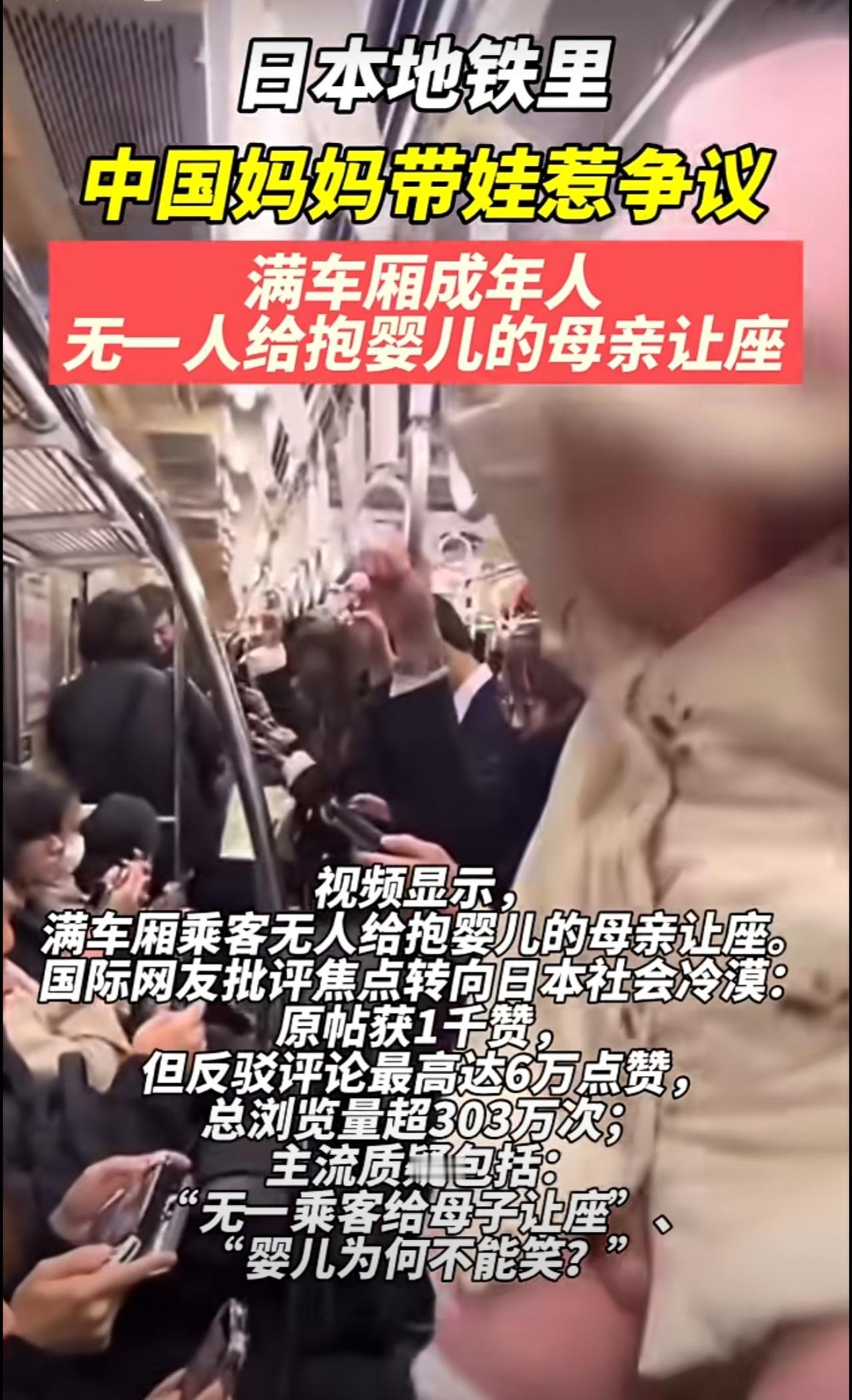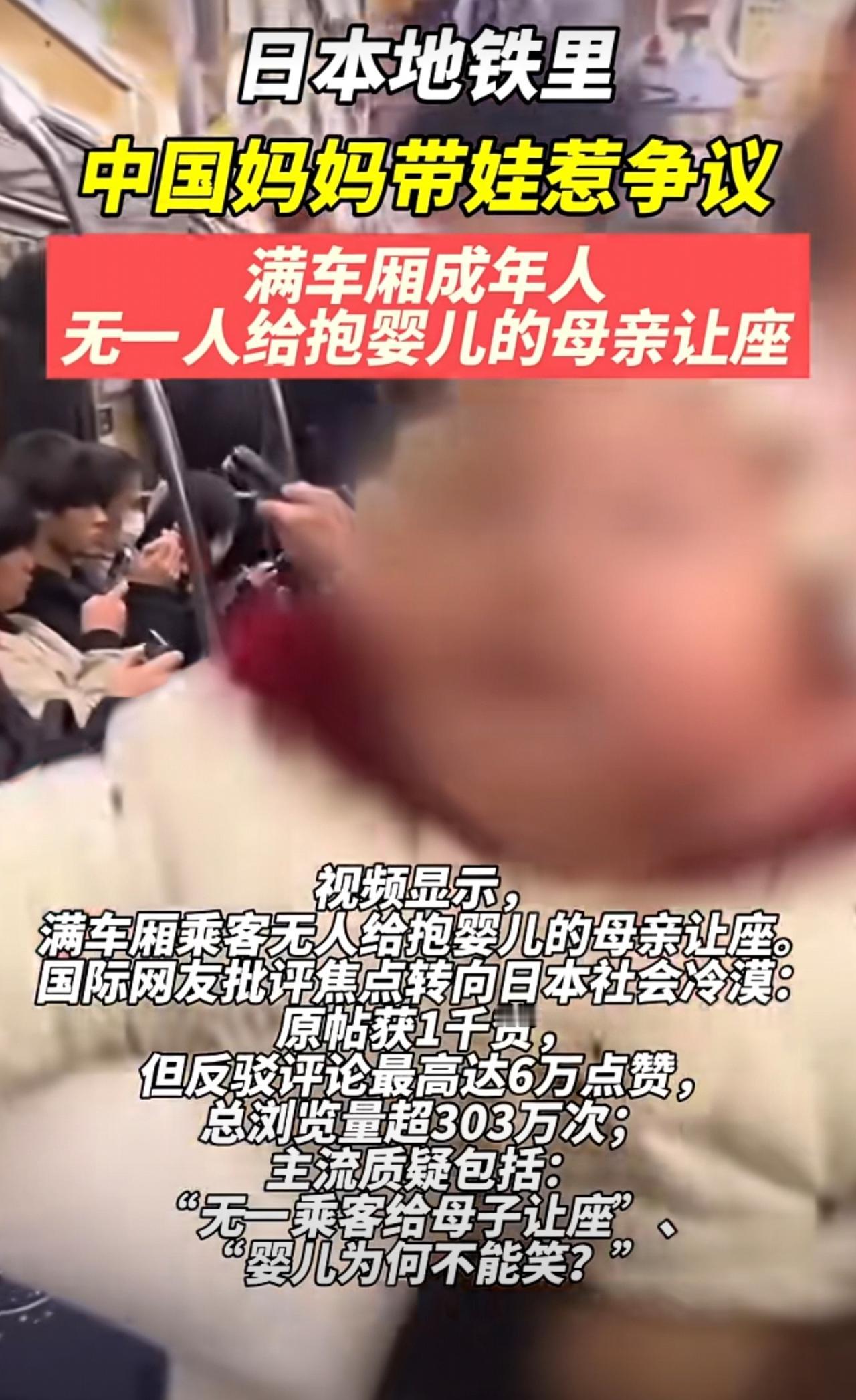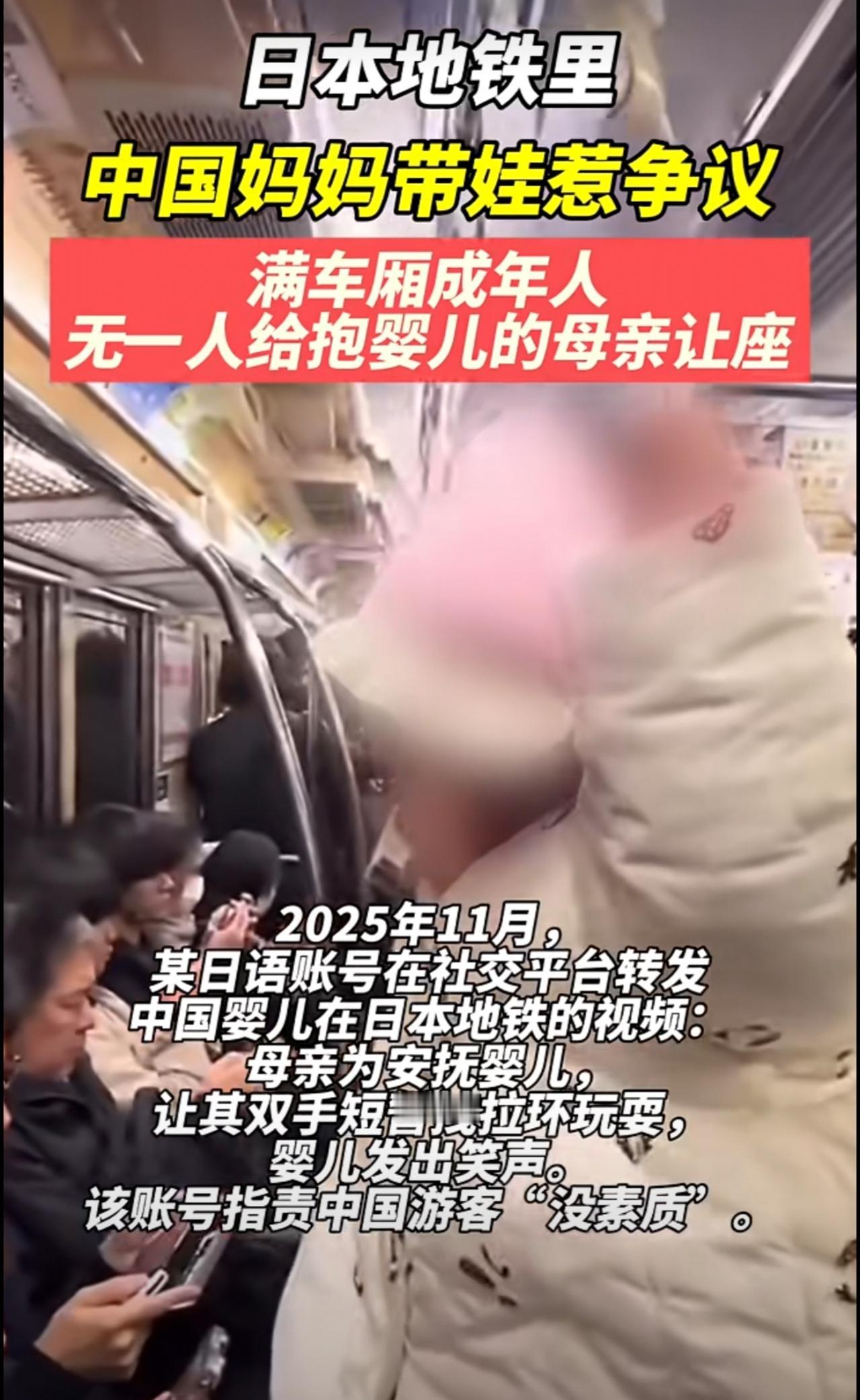日本地铁里中国妈妈带娃惹争议, 满车厢成年人 无一人给抱婴儿的母亲让座