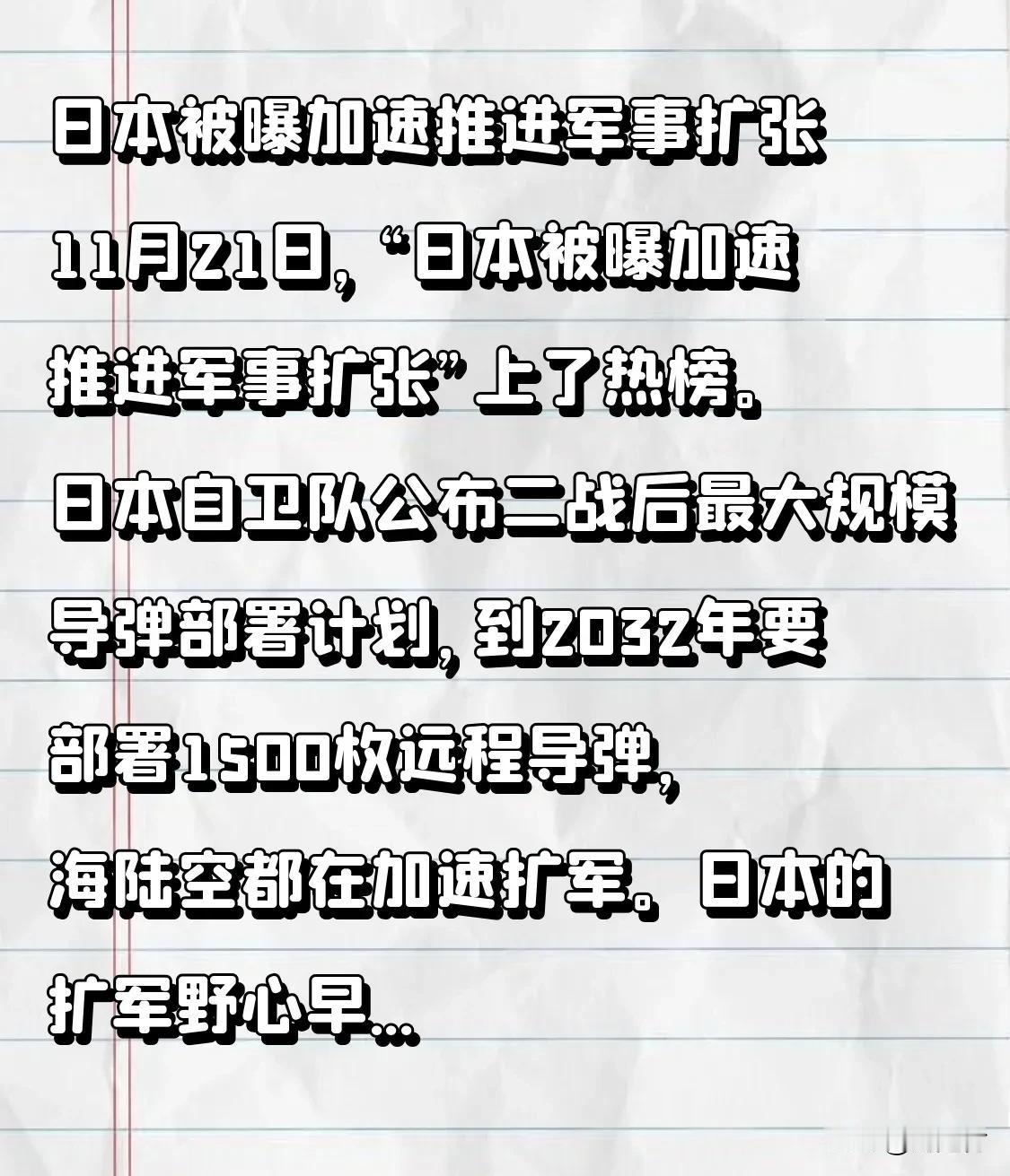 日本被曝加速推进军事扩张 11月21日,“日本被曝加速推进军事扩张”登上热榜。日本自卫队公布二战后最大规模导弹部署计划,预计到2032年部署1500枚远程导弹,其海、陆、空三军均在加速扩军。 日本的扩军野心早有端倪。20世纪90年代起,日本借配合美军行动与维和之名,逐步突破军事限制。2022年,日本态度更激进,自卫队从防卫性质转变为进攻性质。美国不仅不限制,还从默许转为协助。 尽管日本历史上有军事胜利“辉煌”,且有美国撑腰,但现实是中国军力和经济实力远超日本。一旦开战,日本本土城市首当其冲,其经济也会因依赖中国市场和供应链而遭受重创。日本此举无疑玩火自焚,终将自食恶果。日本军事挑衅 日本战略改变 日本侵略野心 日本战略困境