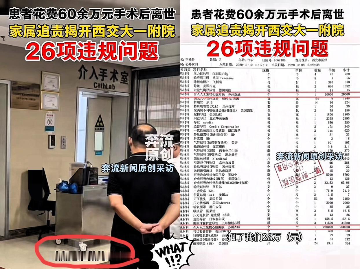 西安, 一女子父亲头晕,去医院治疗, 不料手术后其父亲陷入昏迷进了ICU, 女子不相信医院,决定转院,转院被 告知60多万医药费,医保报了近30万,家属掏了30多万,结果人还没救回来! 女子翻看病历和清单,发现一堆问题,像自费心脏瓣膜没家属签字,还有莫名其妙的“会阴清洗”,纱布、缝合胶费用高得离谱! 她筛出40多项违规,觉得十几万是不该花的。向医保局举报后,核查出26项违规,涉及7.5万元违规医保基金! 医院是救命的地方,不应成为敛财的源地!这种骗取医保的行为,必须零容忍。