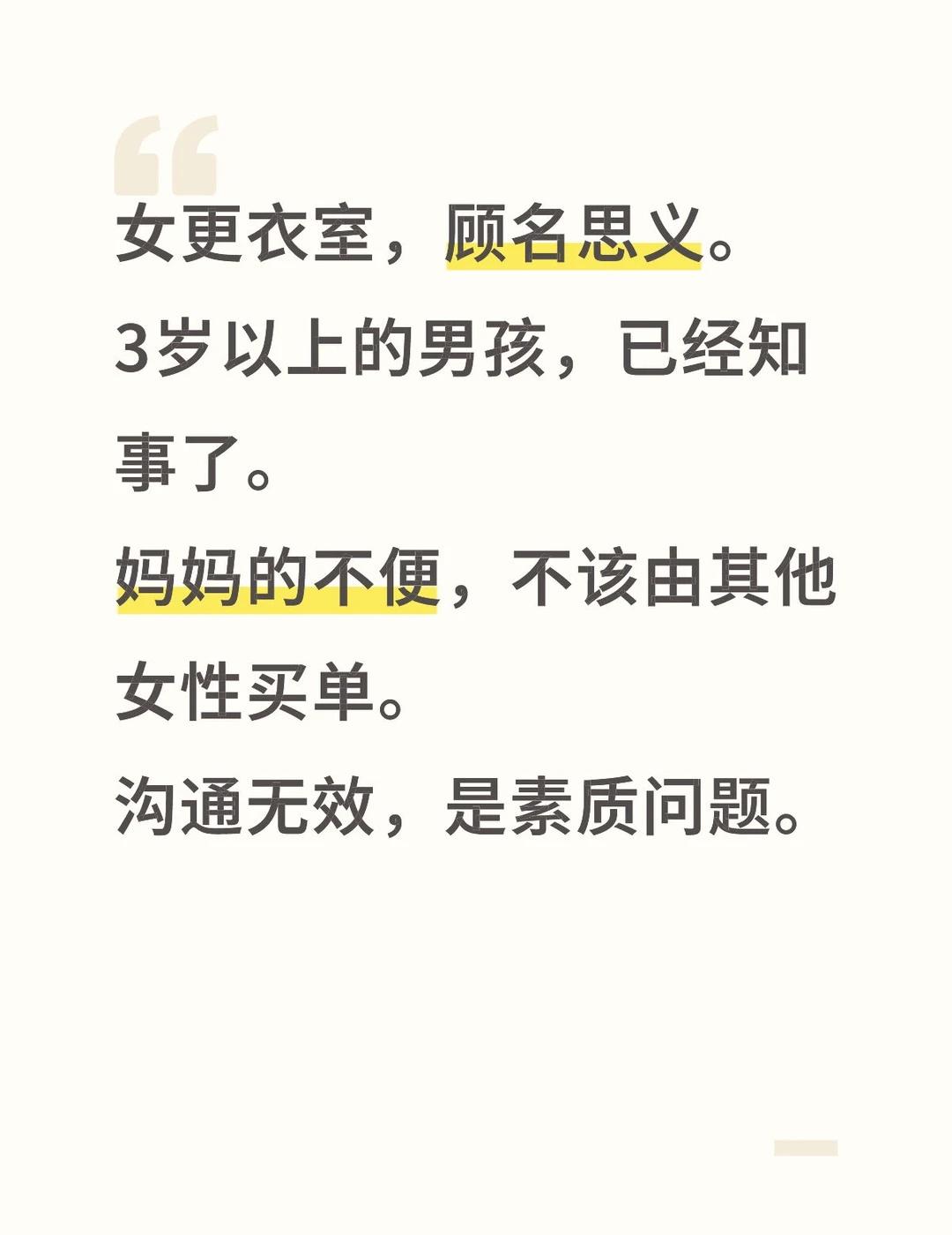《女更衣室,谢绝男童入内!》 刚运动完在女更衣室洗完澡,一位妈妈带着一个大概4、5岁的小男孩走了进来。小男孩已经有明显的好奇心和认知能力了。 我犹豫了一下,还是上前礼貌地跟那位妈妈说:“您好姐,这里是女更衣室,带小男孩进来可能不太方便,你可以让他坐在前台旁边的桌子,不会出事的” 结果……对方完全无视了我,就当没听见关上门去换衣服,放小男孩一个人在更衣室站着跟我四目相对 无语 大无语事件 健身房管理 性别教育