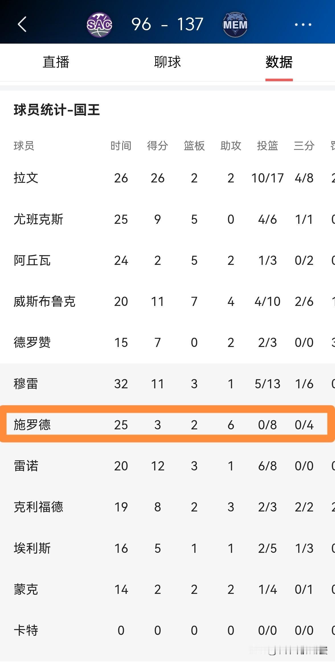国王后卫施罗德真是名副其实的铁匠!在今天国王客场以96:137惨败于灰熊的比赛中,施罗德的手感冰凉到了极点。整场比赛下来,施罗德替补出战25分钟,投篮8中0,其中三分球4中0仅仅依靠罚球得到3分,还有3次失误,他的场上正负值-16。 国王的两大后卫威少和施罗德真是一个比一个差,他们简直就是球队的毒瘤。