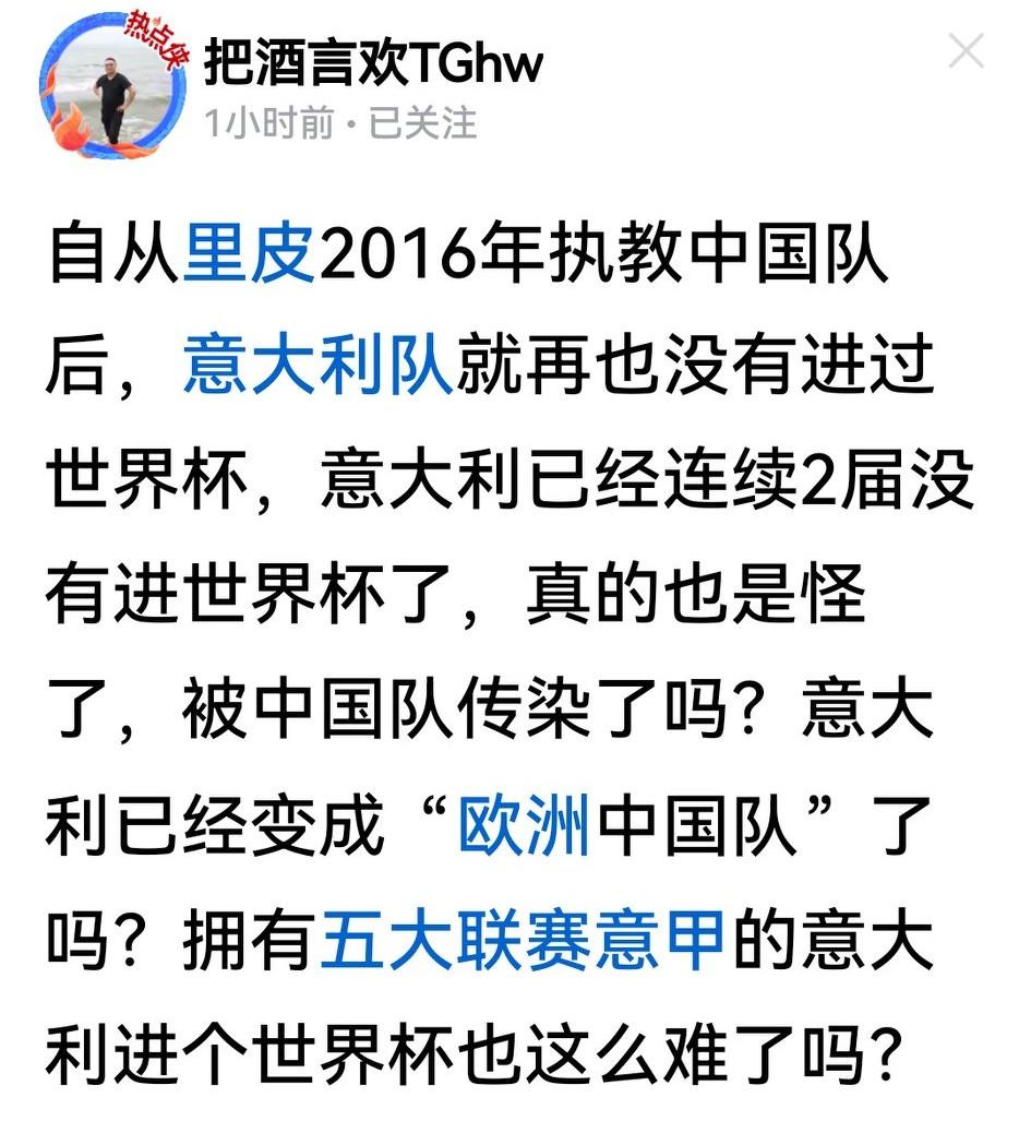 哈哈,真是脑洞又开,有网友总结:自银狐里皮9年前执教中国队后,意大利国家队就再也没进过世界杯、已变成“欧洲中国队”。 里皮执教中国队,既没归化意大利国脚,也没带走其教练,哪影响球队实力?要说中国队毛病传染了意大利,但里皮当初是愤怒中拂袖而去,表明主动与“病菌”隔绝,且他回国后未再执教任何球队,哪扯得上关系? 所以扯意足与国足的关系,并非重大发现,也不是啥玄学,而是友友在调皮。[大笑]