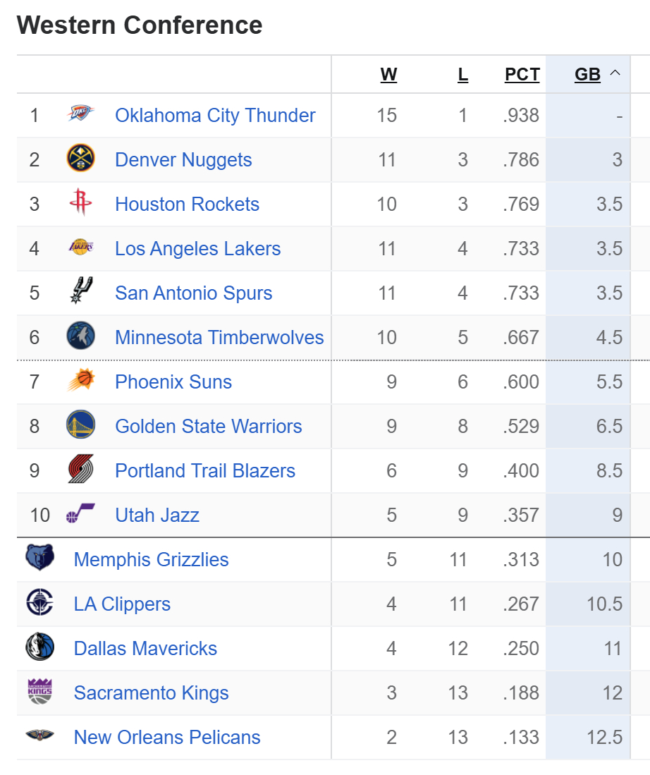 马刺战胜老鹰,战绩与湖人同为11胜4负。明天火箭大战掘金,湖人有望排名上升一位。