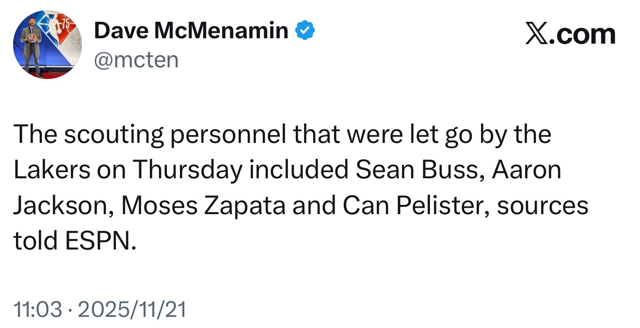 ESPN:被湖人解雇的球探是Sean Buss,Aaron Jackson,Moses Zapata和Can Pelister。