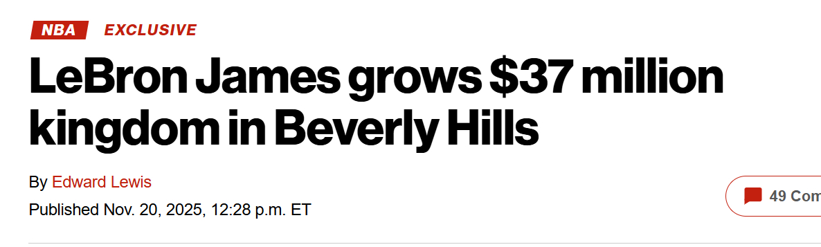 纽约邮报撰文报道詹姆斯位于比佛利山的豪宅近况:詹姆斯最初于2020年以3700万