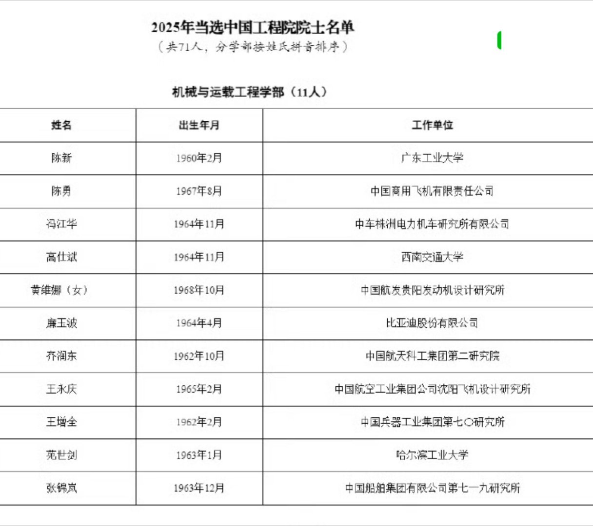 2025年的两院院士增选结果,商飞还没有发喜报——商飞的工程总师陈勇入选工程院院士,航发有2位,航空工业有1位。