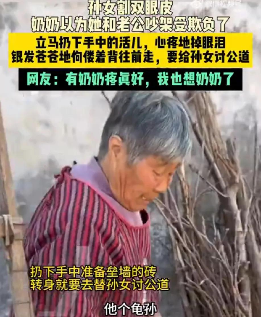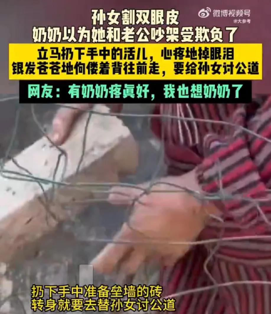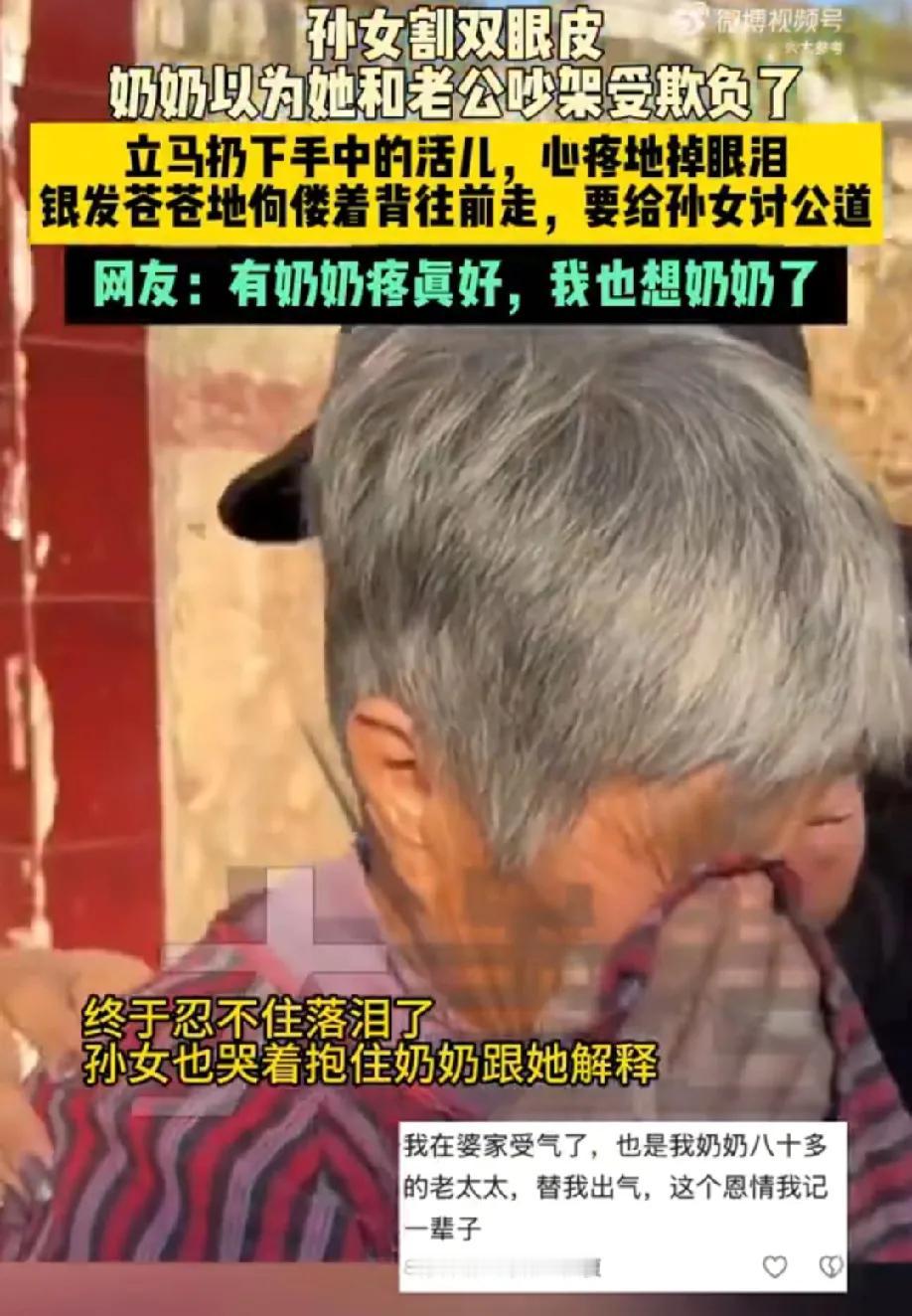 奶奶毫无保留的偏爱是女孩一生的底气 河南一女孩割双眼皮后回家,奶奶以为她和老公吵架受欺负了,立马扔下手中的准备垒墙的砖,银发苍苍地她佝偻着背往前走,要给孙女讨公道。 “我不愿意,他个🐢孙,成天我不放心都是你,知道不?”奶奶嘴上骂着,眼里包含着泪水。奶奶终于忍不住心疼地掉眼泪,孙女也哭着抱着奶奶解释。 奶奶哭了可以理解,孙女哭了也可以理解,我为啥也哭了? 隔代亲的具象化,奶奶心疼里藏着最纯粹的爱,有这样心疼自己的奶奶真是世界最幸福的事,奶奶毫无保留的偏爱是女孩一生的底气。